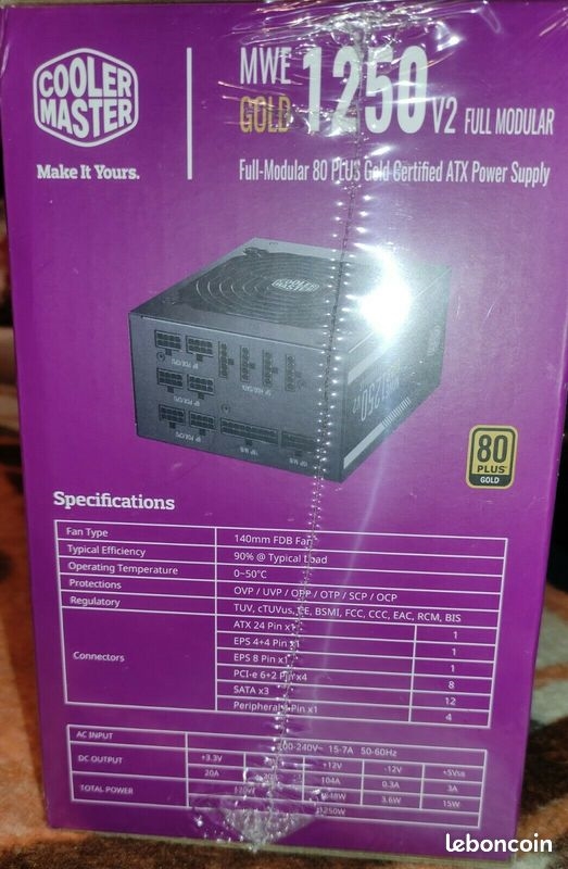Salut, j'ai une Cooler Master MWE Gold 1250W V2 sous blister neuve d'un retour RMA directement de Cooler Master au Pays-bas, je la fais à 180€ out.