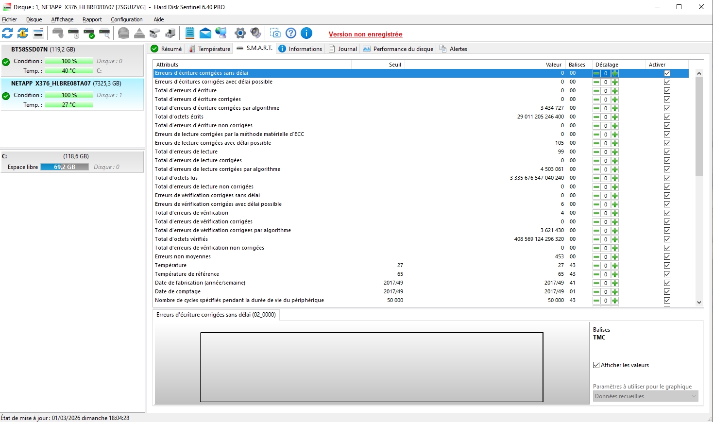 Ce sont des disques SAS 12 Gbps datant pour la plupart de 2017 et stockés depuis plus de 2 ans, temps sous tension 2170J ( 6 ans )