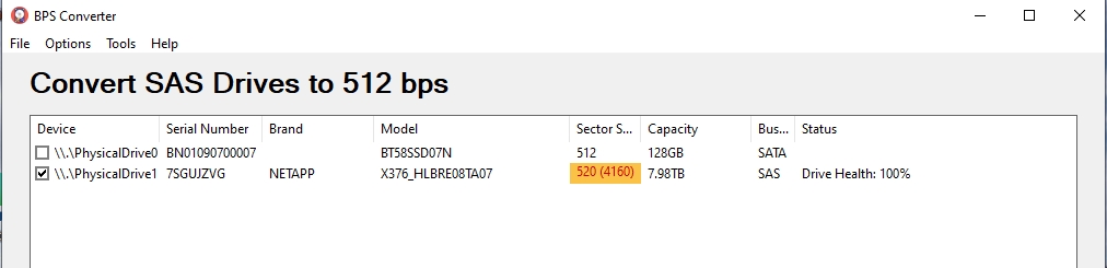 Ces disques sont actuellement en bloc/secteurs de 520 au lieu des 512 classiques  (nécessitent un conversion bas niveau sg_utils ou BPS converter)