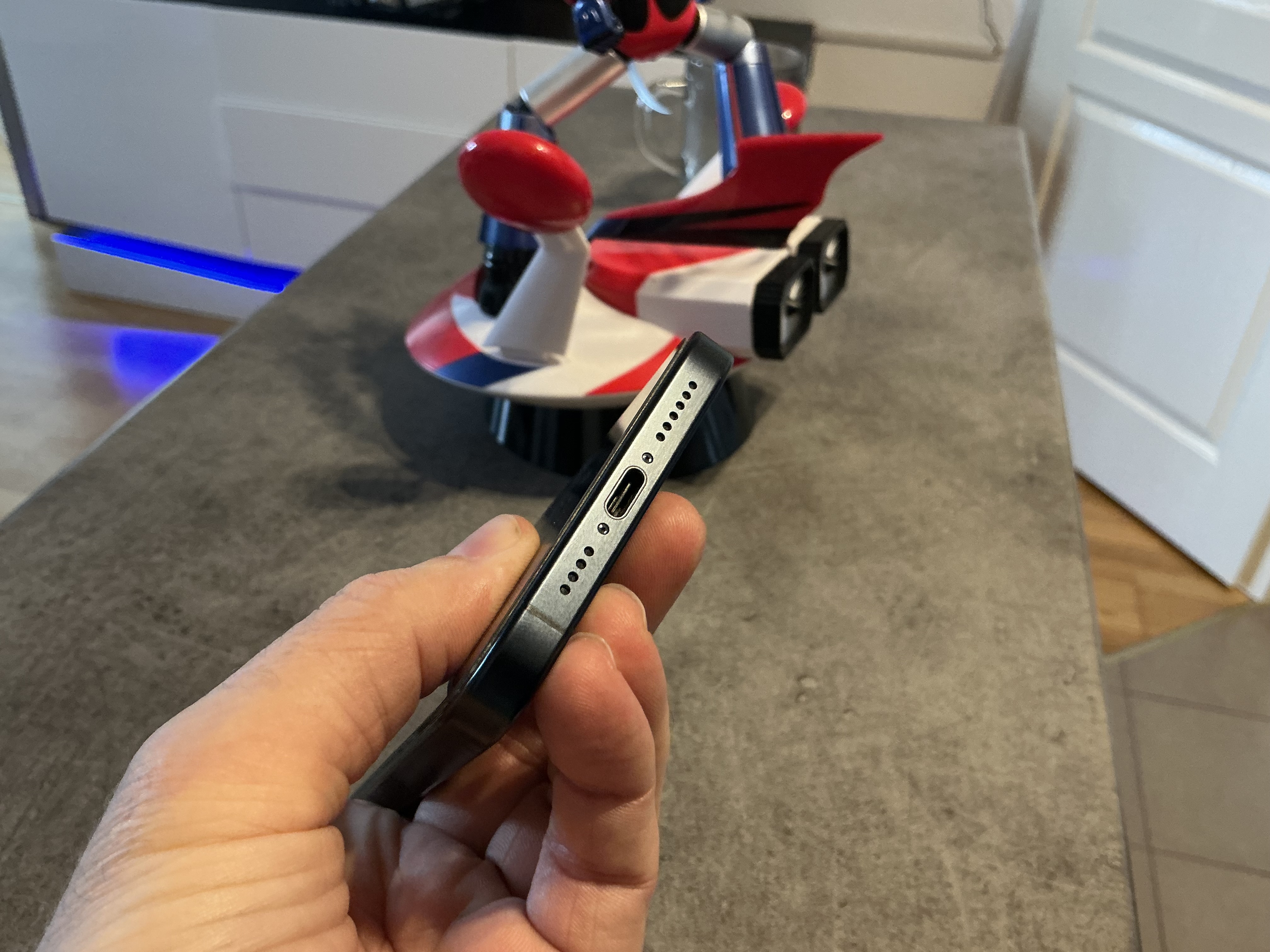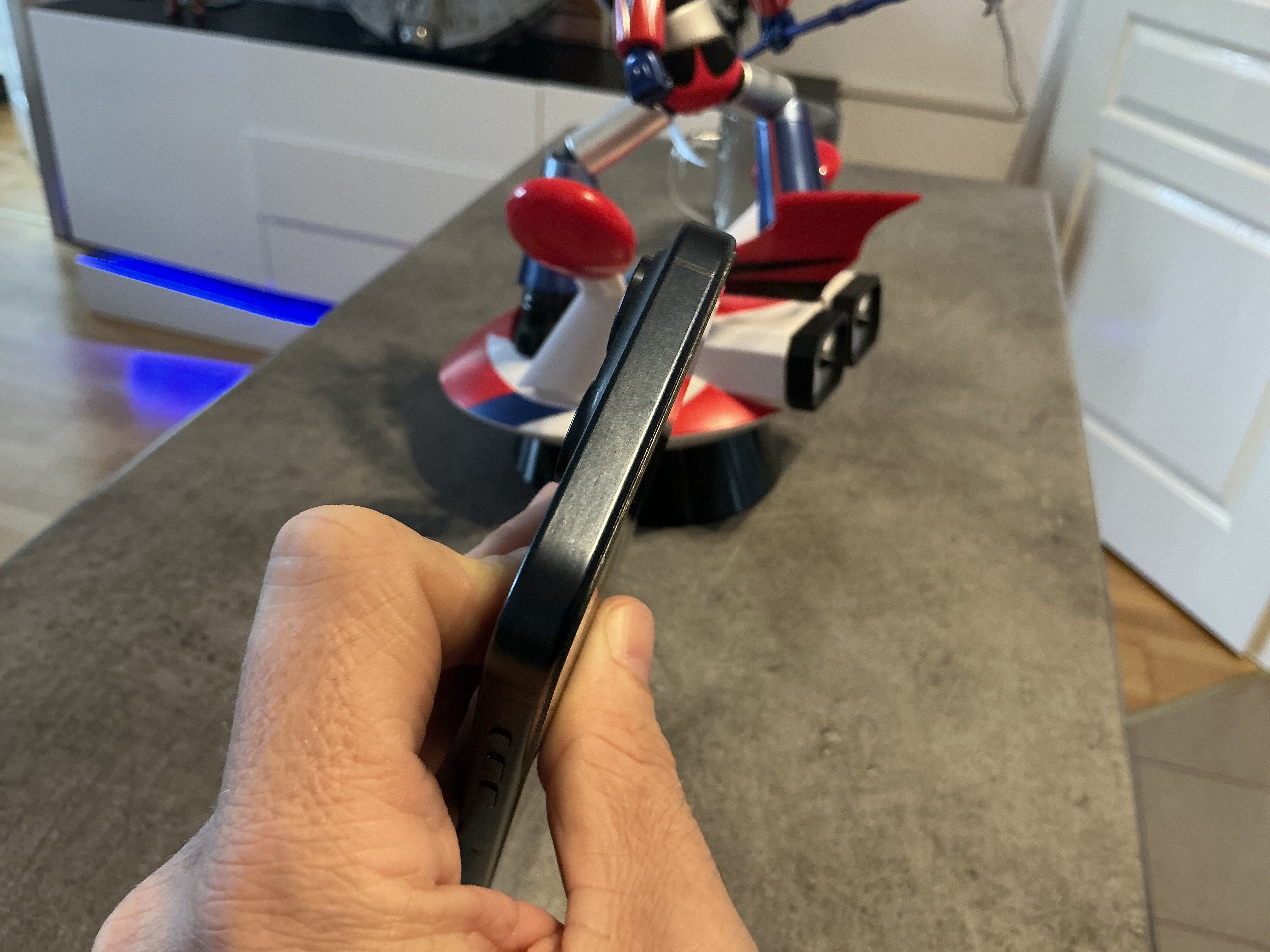 Je viens de voir, je pensais que c’était une poussière, c’est vraiment tout petit, un point blanc, je pense que c’est du à la coque, tu peux le voir sur cette photo, c’est vraiment minuscule