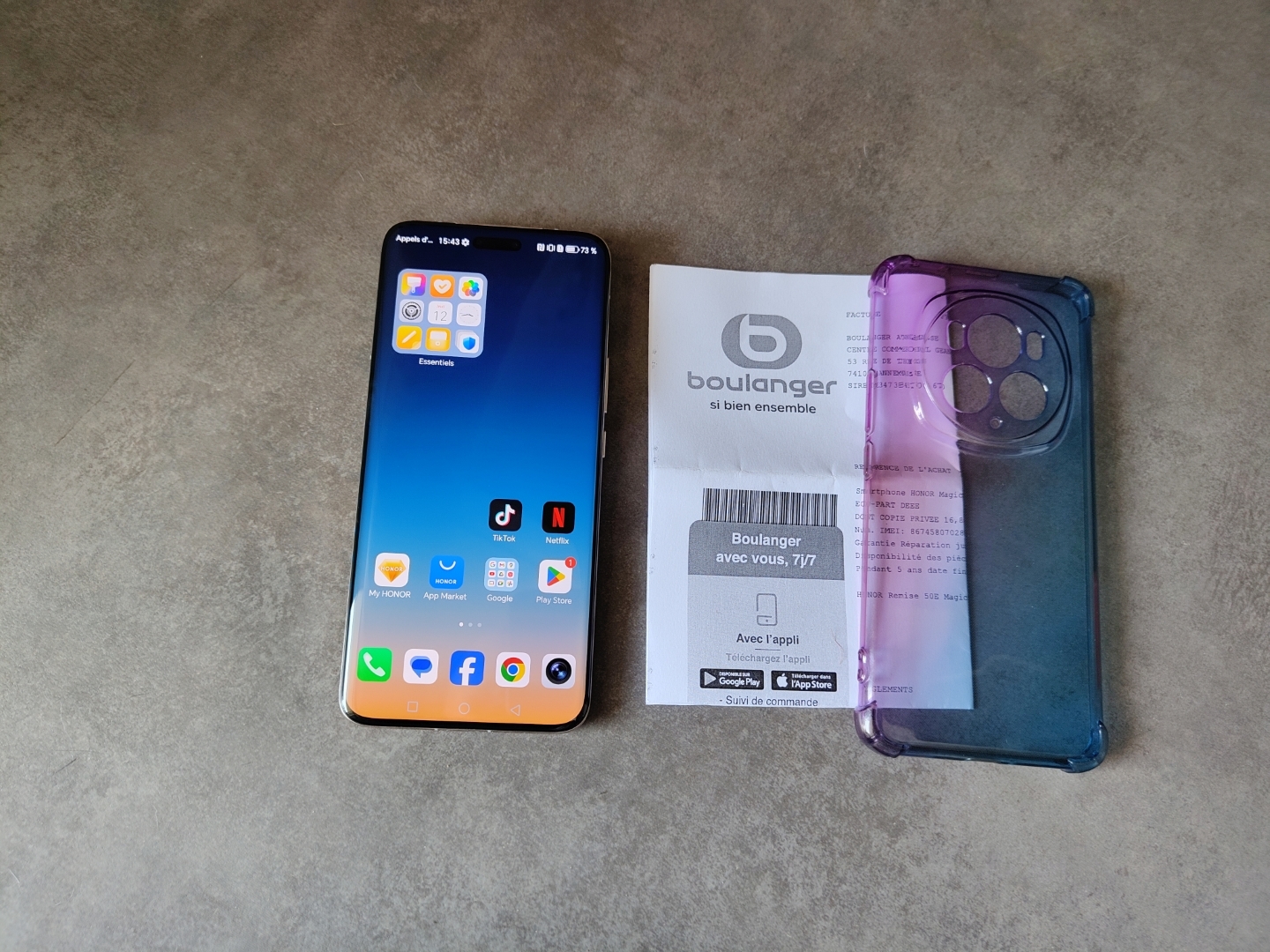 Honor Magic6 Pro 5G vert 512Go-12Go débloqué tout opérateur. (Android 15) Il a bien tout Android sans problème (Google Play Store OK....). Il est en très bon état, aucune rayures sur l'écran. Tout marche parfaitement très bien sans problème. Il date du 28/02/2024, encore garantie jusqu'au 28/02/2026 Facture Boulanger fournie. C'est une 2ème main. Attention : Il y a juste le té et la facture comme sur les photos, rien d'autre. Où échange contre console ou téléphone ou pc gamer, faire offre. + rajout de ma part ou de votre part suivant offre. Je le vends à 449€fdpin en Mondial Relay avec assurance. Possible par la poste + €.