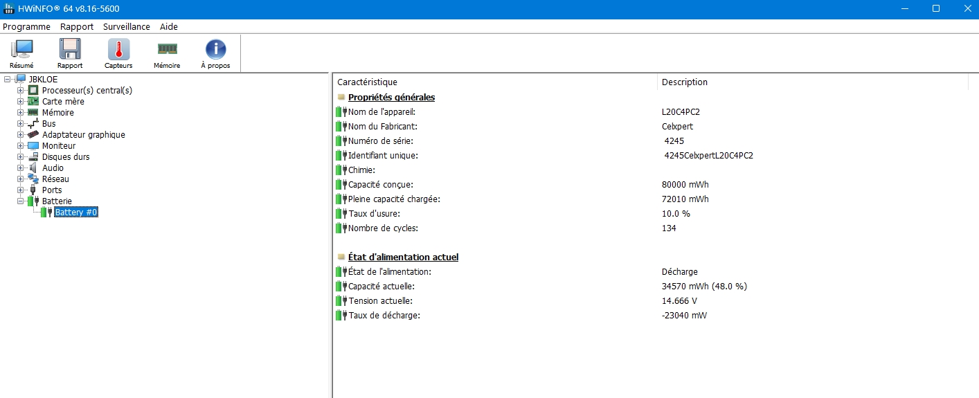 Fournit avec l'alim 300w. Taux d'usure de la batterie en screen.