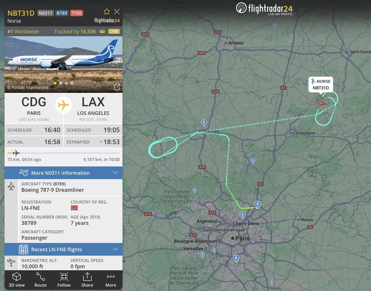 Dans le cas du vol évoqué plus haut, on voit qu'il a d'abord été attendre sur le circuit d'attente le plus proche de sa trajectoire après le décollage (cas typique "on doit faire des checks" ), et après la prise de décision de retour terrain, il a été tourner sur le circuit d'attente dédié pour vidanger (quasiment pas de population en-dessous et à l'écart de notre trafic habituel pour ne pas tout perturber), puis est venu se poser. Cas d'école comme on nous l'enseigne.