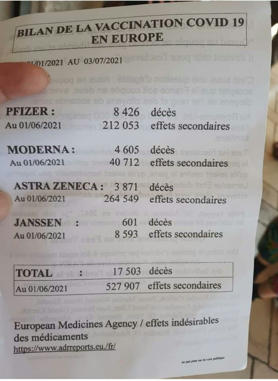 Ils y sont. Ce site recense toutes les morts non accidentelles après vaccination. Il y a même des morts d'hépatite dans le lot. Il prouve juste que Pfizer n'a pas trouvé le sérum d'immortalité... --------------- Ducouïte : maladie consistant à parsemer ses posts de "du coup" et "pour le coup" | TU des moteurs de recherche ! |