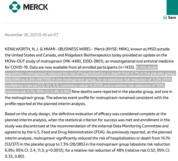 Tolor Mais heu... | Résultat finaux pour le Molnupiravir. 30% de réduction du risque d'hospi.