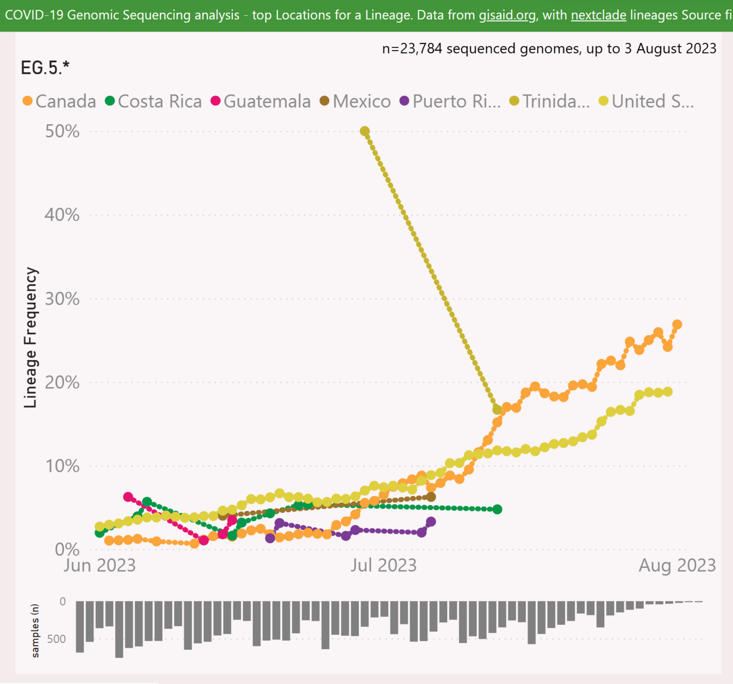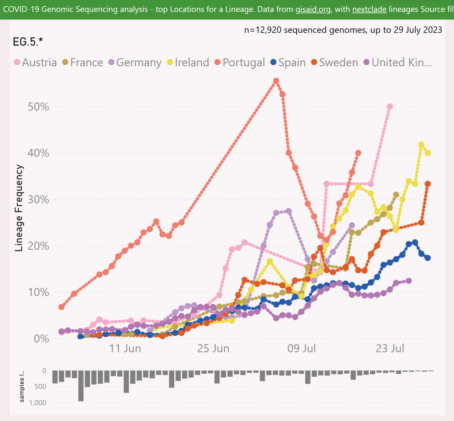 lonely | Progression des variants EG.5 dans les séquençages remontés dans GISAID pour différents pays
