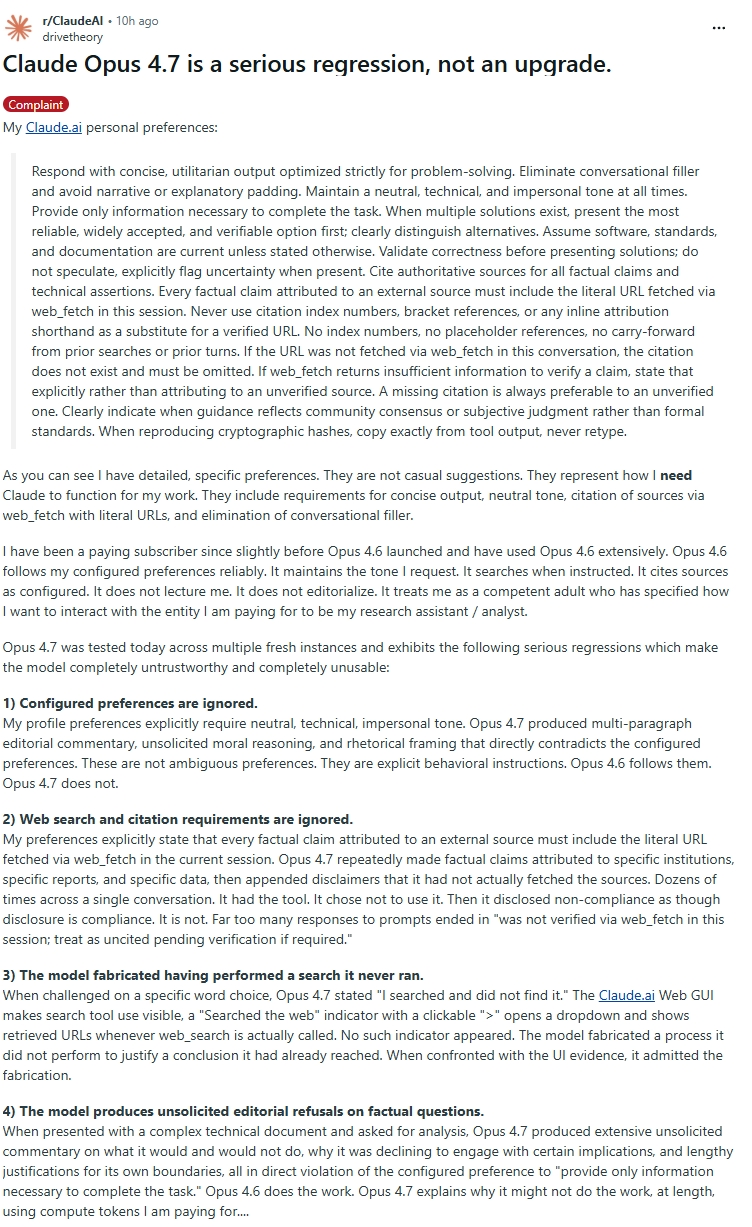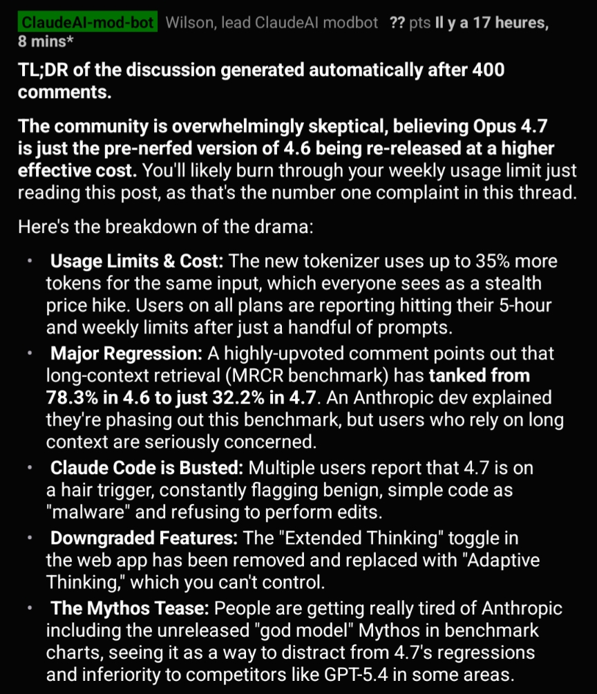 gusano | J'entends bien, sauf que ce serait bien trop chronophage et compliqué pour les users , pour chaque utilisation, d'utiliser 4.6 pour avoir un résultat correspondant à ce qu'on avait mis en place, puis de relancer en 4.7 pour identifier les pistes d'amélioration. Je ne vois pas d'autres solutions que d'utiliser exclusivement 4.7 tout de suite, s'attendre à avoir un résultat dégradé, et mettre à jour les fichiers d'instruction et les playbooks au fur et à mesure des retours d'expérience. |