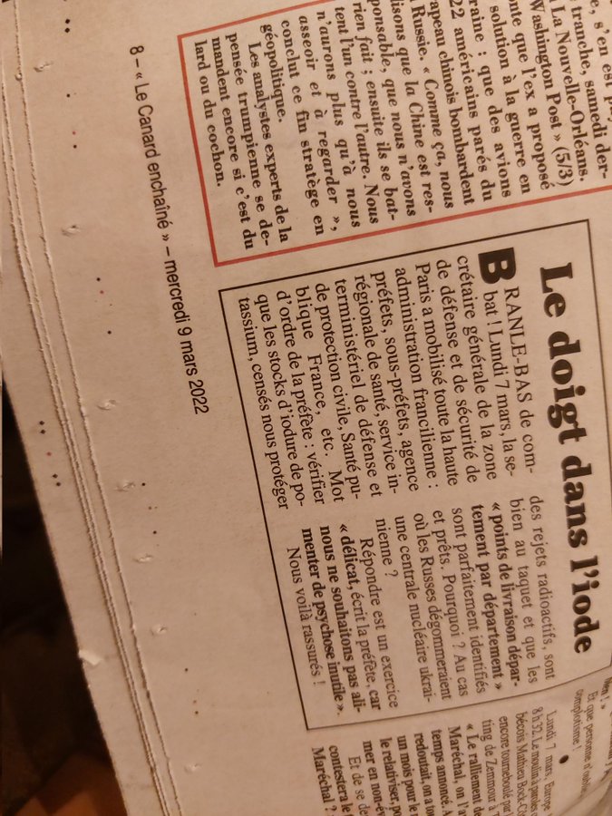Mais c'est inutile en cas de bombardement nucléaire car il n'y a pas d'iode radioactif. En cas de soucis sur une centrale en Ukraine on n'aura rien en France. Cela sera tellement dillué qu'il sera plus dangereux de prendre de l'iode que de ne rien faire. Quand il y a eu l'accident de Fukushima est-ce qu'on a consommer de l'iode en France ? En cas de bombardement d'une ou plusieurs centrale française on aura surement d'autres soucis bien plus important qu'eviter un potentiel cancer de la thyroïde sur les enfants. |