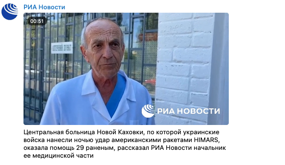 tfpsly Sly | Explosion d'un dépôt de munitions à Nova Kakhovka, près de Kherson : les Russes disent qu'un enfant handicapé humanitaire aidait à la garde a été tué, et que l'explosion était en fait sur un hôpital. Avec pour preuve l'interview d'un "médecin", devant l'hôpital... intact.