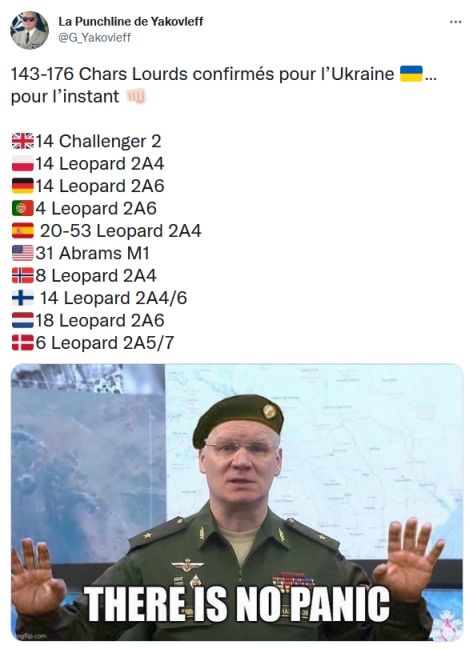Les russes galèrent à produire massivement des chars de dernière génération rien qu'avec les sanctions depuis 2014 et celles de 2022 sont 100 fois plus lourdes. Les russes ont volé (littéralement) les chars que les indiens avaient envoyés en Russie pour être upgradés. Ils ont volé les chars indiens pour les envoyer en Ukraine parce qu'ils n'en avaient pas assez sous la main. Les indiens sont pas prêts de leur racheter des chars, d'ailleurs ils ont déjà annulé un contrat d'avions de combat. Message cité 2 fois Message édité par Ernestor le 25-01-2023 à 21:24:43 --------------- Idéaliste pragmatique gauchiste cherche camarades pour fonder un parti |