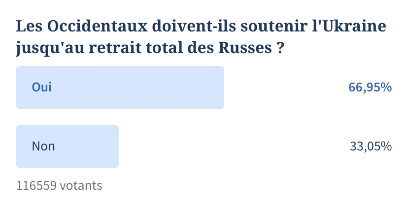 Seulement 2/3 ? Pour des gens qui sont partisans du "tel pays appartient à ses habitants exclusivement" c'est bizarre qu'ils se désintéressent de ce cas : l'Ukraine n'a pas vocation à accueillir tous les russes de la planète. Qu'est-ce que j'apprends ? Un train débarque en Ukraine, bourré de migrants russes ? Qu'ils retournent en russie ! Message édité par chipeauteur le 14-11-2022 à 11:40:50 --------------- Réveillez-vous, ça fait 2 boeing par jour :fou: |