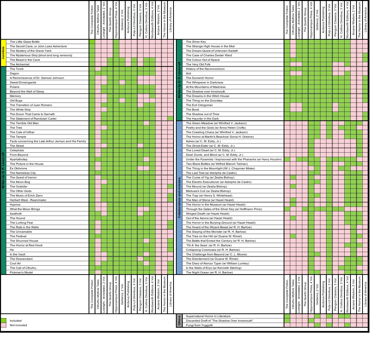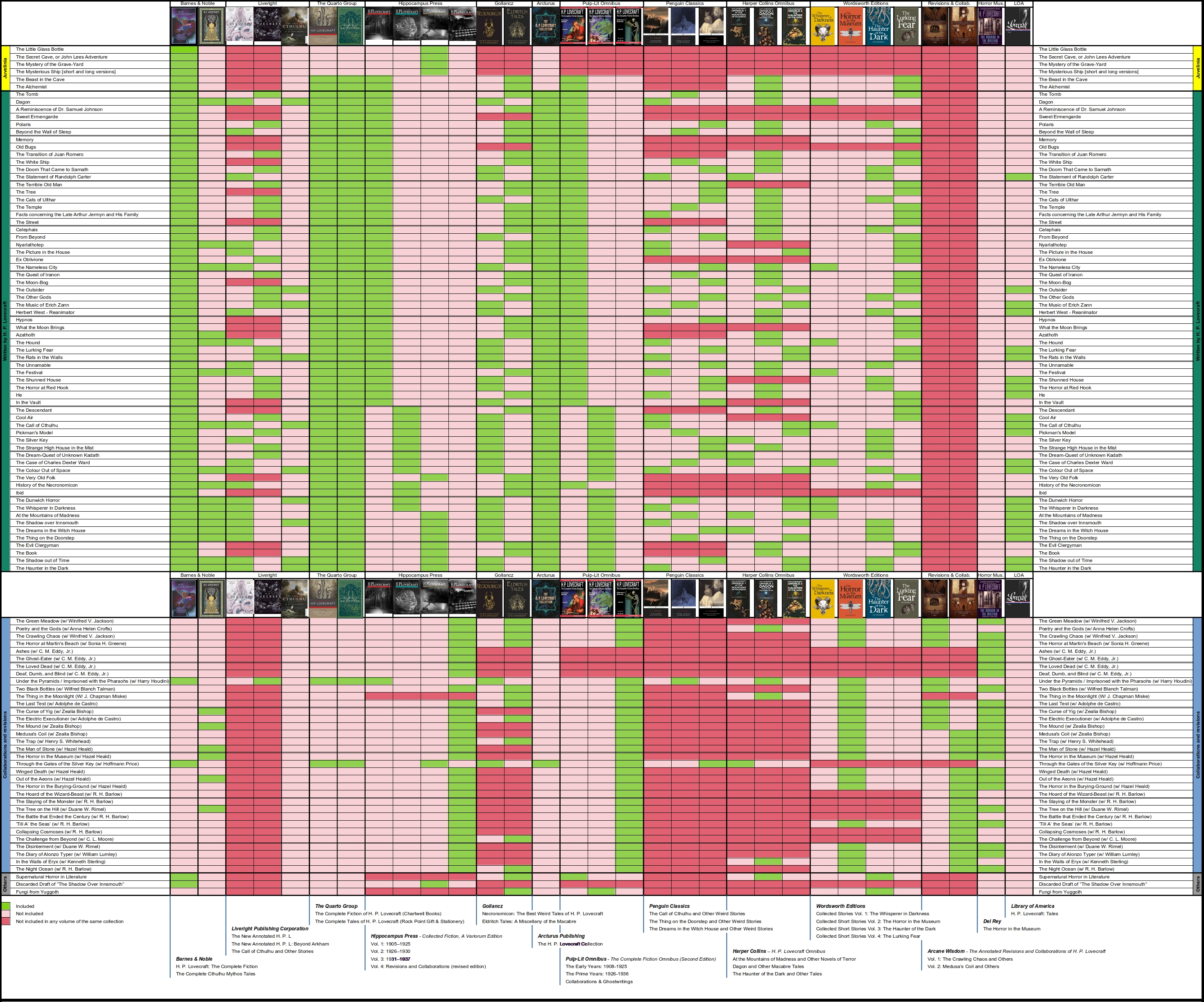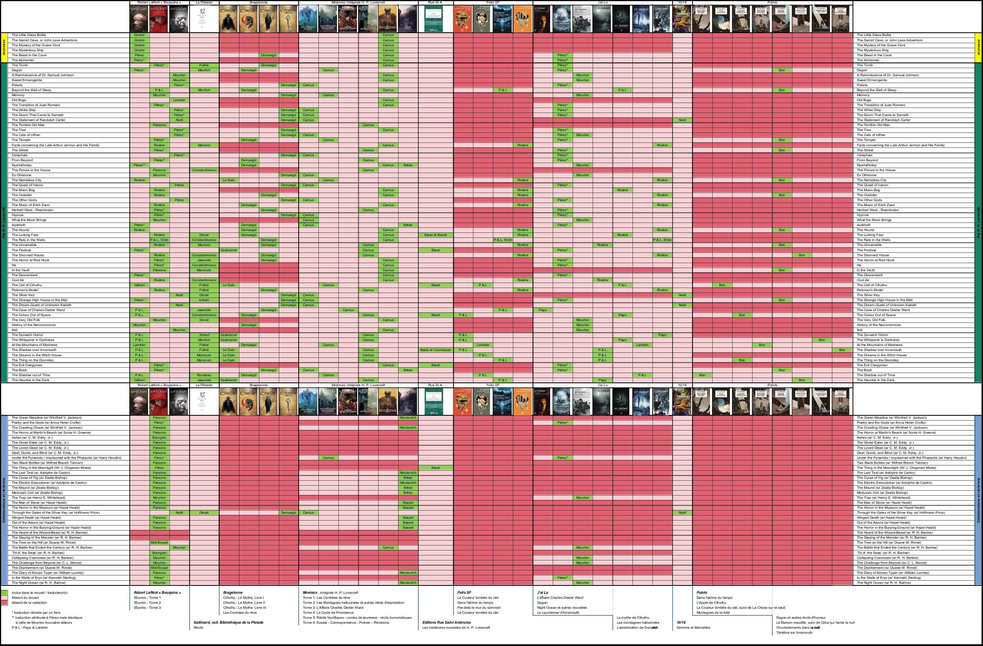 BoraBora Dilettante | Je sais pas si ça vaut la peine de l'inclure dans ton tableau mais il y a un recueil à la Library of America. J'ai une dizaine de volumes de chez eux (tout Chandler et Hammett + 4 volumes d'Elmore Leonard). Ce sont de beaux bouquins, reliés et toilés, pas chers.