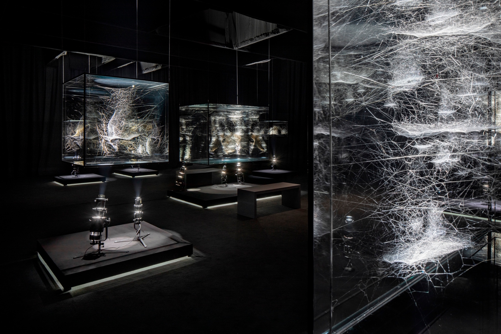 Ça me fait penser à un truc que j'avais vu au Louvre dans une expo avec de l'art contemporain, je ne sais pas qui c'était, probablement Saraceno ? Ça devrait te plaire, c'était un aquarium en plexiglas avec des araignées qui avaient fait des toiles dedans, et sur fond noir avec un petit spot ça rendait très truc contemporain et le contraste était assez intéressant entre le plexi froid et tout droit et les toiles qui sont à la fois pleines d'une certaine régularité et dans des formes très organiques.