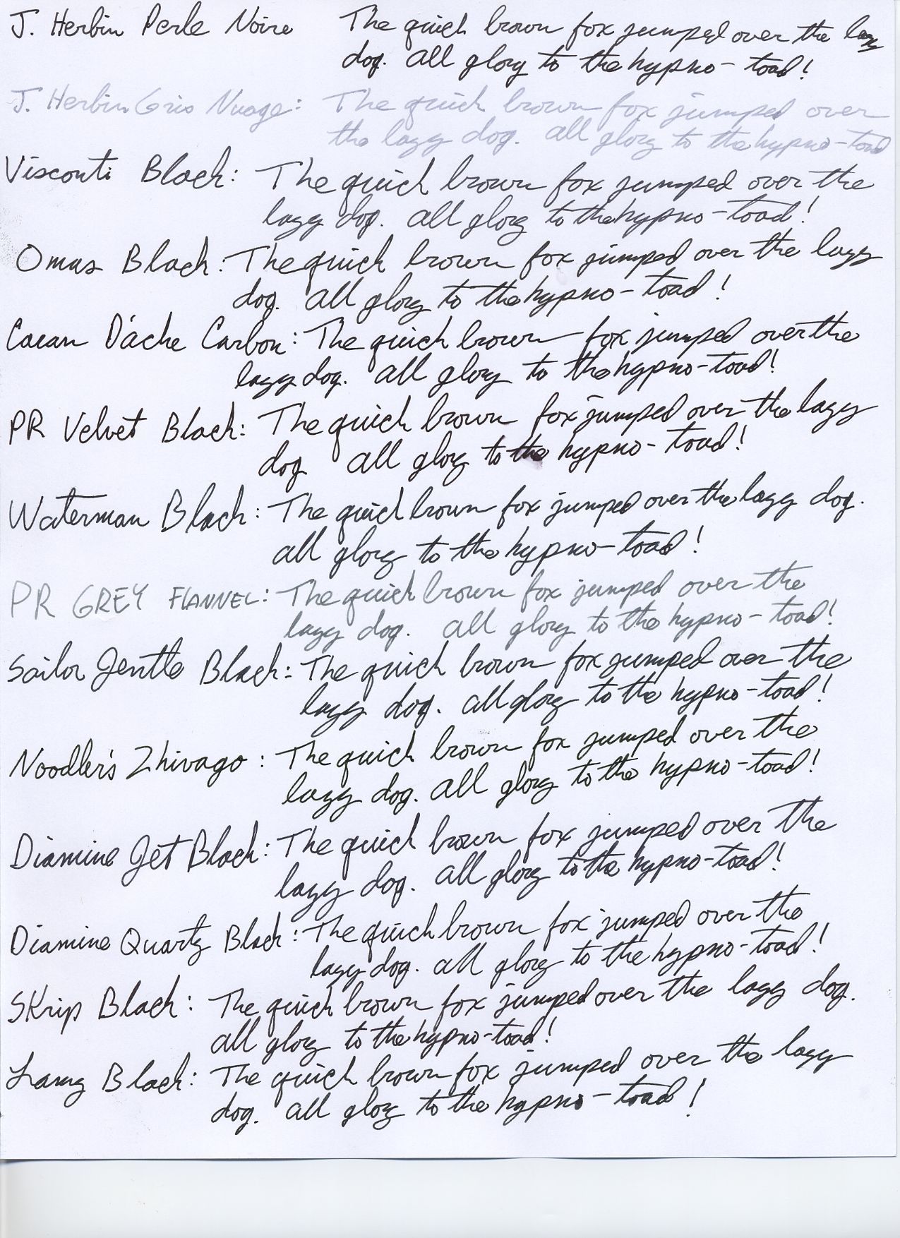 Pour de l'encre noire vraiment noire, y'a Aurora Black, Pelikan 4001 Black et Noodler's Old Manhattan ou Heart of Darkness. Par contre, plutôt en achat sur internet, je doute que t'en trouves en boutique. Après, ça dépend de ce que t'appelles gris. Si c'est noir avec des "ombres" grises, c'est normal et quasiment toutes les encres noires sont comme ça. Si c'est gris pale comme quand il reste un peu d'eau dans le stylo, c'est pas normal. Waterman et Diamine sont réputées pour bien se comporter avec tous les stylos. Waterman est pas franchement la plus noire, mais ça reste acceptable. Lamy black est pas très noire à mon goût, et assez sèche, je suis pas fan. Parker Quink Black, jamais testé, mais réputée pour bien se comporter. En magasin que tu risque de trouver Waterman et Parker (et peut etre Herbin, c'est une marque française...), après c'est moins sûr... Des liens, comparatifs : http://www.pariahzero.net/Fountain%20Pen/Fountain1.png http://www.fountainpennetwork.com/ [...] 179959.jpg http://www.fountainpennetwork.com/ [...] 468022.jpg http://www.fountainpennetwork.com/ [...] 573161.jpg http://thewritingdesk.co.uk/showpr [...] subr=black En espérant que tu trouves ton bonheur