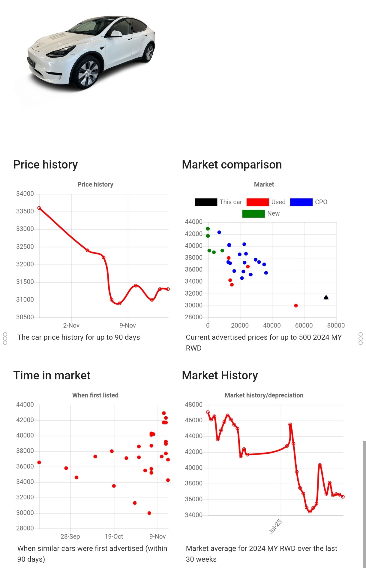 Combien tu payes dèjà, pour quel kilomètrage ? De mon côtè, dans le même centre de livraison, il y a aussi une MY 2024 Prop BYD de fin 2024 avec 27k km, noire, bon état d'après les photos. 35.2k€, soit 3900€ de plus que celle réservée. Des avis ? C'est presque neuf mais c'est aussi le prix du vrai neuf avec les remises fin 2024, frustrant… https://ev-inventory.com/car/FR-XP7YGCES3RB481272 À mon rythme de roulage, ça ferait environ 2 ans de garantie en plus.. soit 3 avec la garantie CPO. Noire ça m'irait bien aussi. J'aime bien blanc mais les noires sont moins tape-à-l'œil. Faudrait que j'aille voir et que je tranche sur place. Si ça se trouve je pourrais tramsfèrer mes 250€ si je voulais changer. Message cité 1 fois Message édité par kabouik le 15-11-2025 à 04:23:06 --------------- Feedback HFR ≡ [VDS] MR-14EX, LCDVF, Markins, divers §§ |