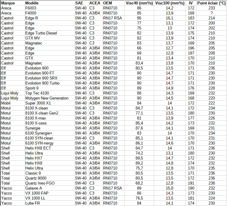 Augmented I don't sleep, I just dream | Attention avec le point éclair, chez Castrol, c'est souvent une autre méthode vs les autres. D92 vs D93. De toute façon, je sais pas si ça vaut grand chose, parfois, ils utilisent un peu d'huile minérale pour ajouter les additifs, donc c'est surtout elle qui s'évapore au début. Le test de volatilité NOACK, c'est mieux, mais plus rare. La norme RN17 RSA peut remplacer la RN0710 pour les anciennes Renault Sport, mais j'ai boycotté. Pour un daily qui faisait surtout des trajets de 17km et de temps en temps quelques arsouilles, ça m'attirait pas trop. J'ai utilisé 3 fois la 0W40 Castrol Edge ACEA C3, dont la dernière version API SP.