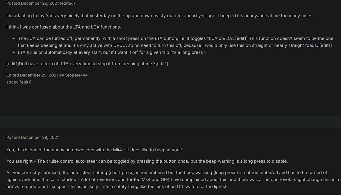Le bouton pour régler la distance permet de désactiver complètement la LTA quand tu restes appuyé dessus, avec des appuis courts ça règle le distance du régul adaptatif. Et de ce que je vois sur les forums c'est pour tout le monde pareil Donc l'option techstream semble être la seule viable si elle existe ^^' Message édité par Athrun Zala le 04-06-2025 à 19:30:42 |