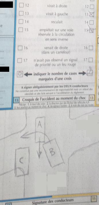 Je suis A, je vais tout droit, B tourne devant moi sans regarder, son attention étant portée sur C arrêté irégulièrement au milieu du croisement.
