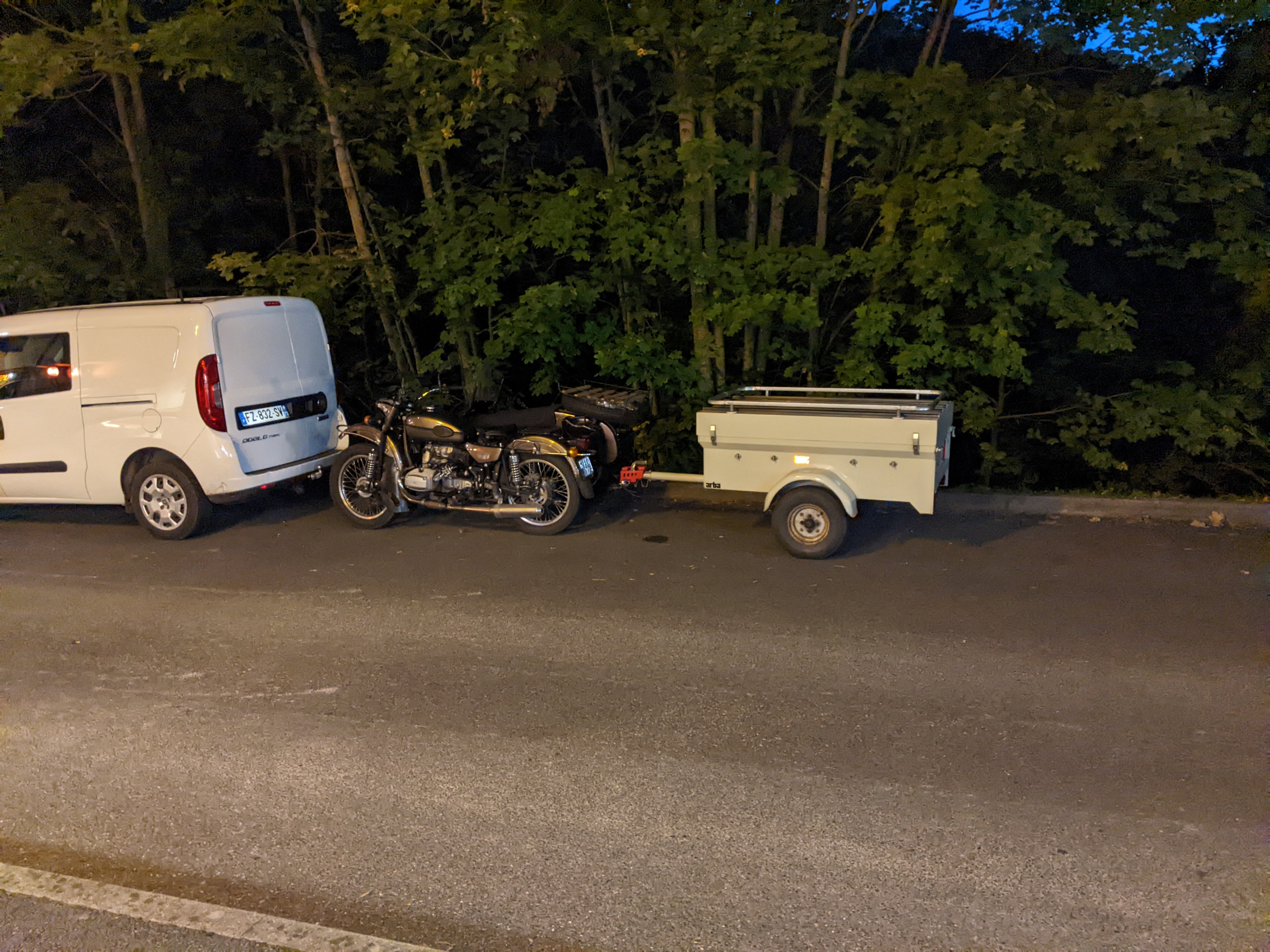 Y'avait cet attelage devant la pizzeria hier. Sidecar Ural + remorque de voiture. [:implosion du tibia]