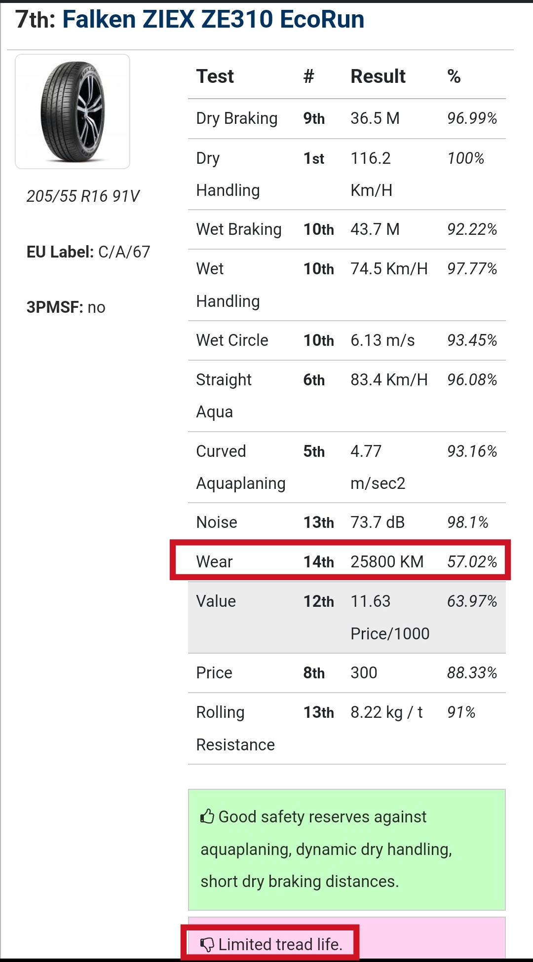 https://www.tyrereviews.com/Article [...] e-Test.htm Il a en moyenne 50 à 60% de durée de vie par rapport au Goodyear Efficient Grip Performance 2 ou Michelin Primacy 4 Plus. |
