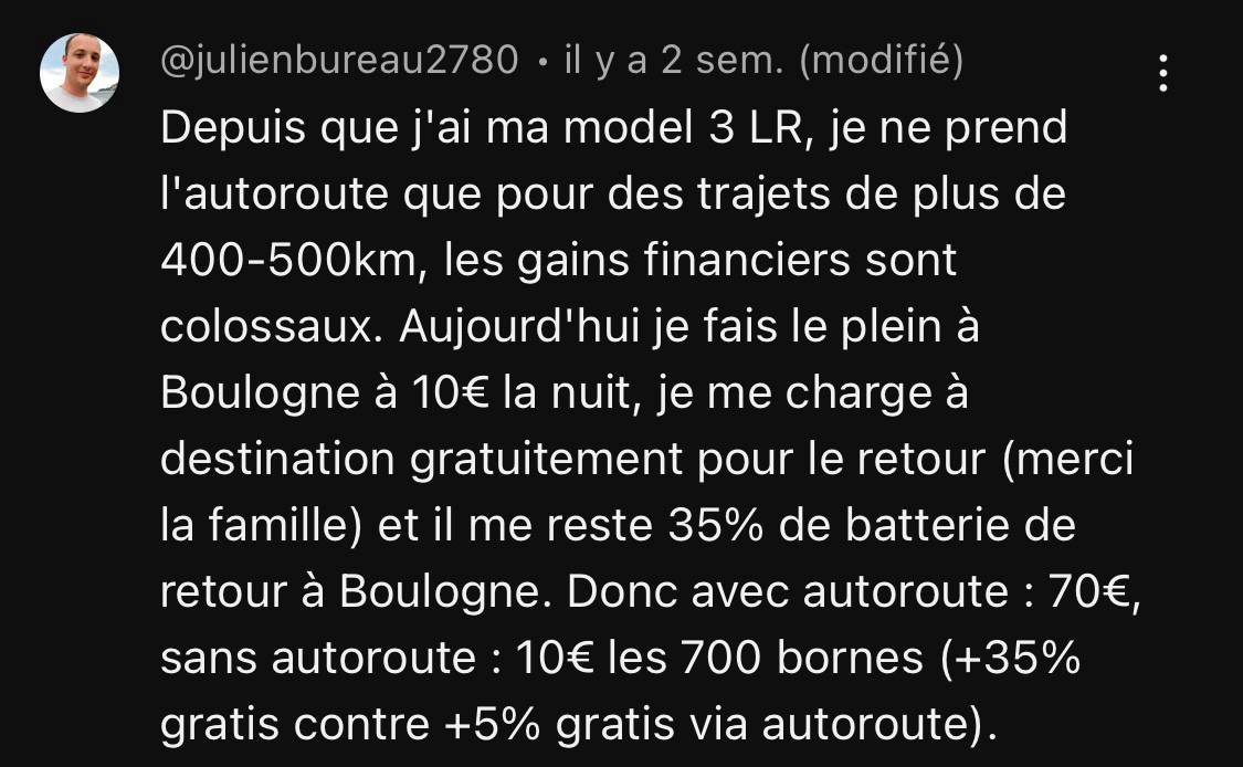 Je vais à la mer 2 fois par mois en moyenne (et 11 mois par an) pour 450kms environ. L’autoroute, c’est 36€ A/R et je passe de 3h à 2h de trajet (en optimisant, 2h20 de trajet pour 21€ d’autoroute) et là, obligé de recharger (vu qu’on consomme plus à 130) donc plutôt 20€ d’électricité soit un bon 55€/weekend au lieu de 8,5 à 15€ !! Si tu le fais 2/3 fois par an, c’est cher mais passe encore. Message édité par aldayo le 21-10-2024 à 13:54:17 |