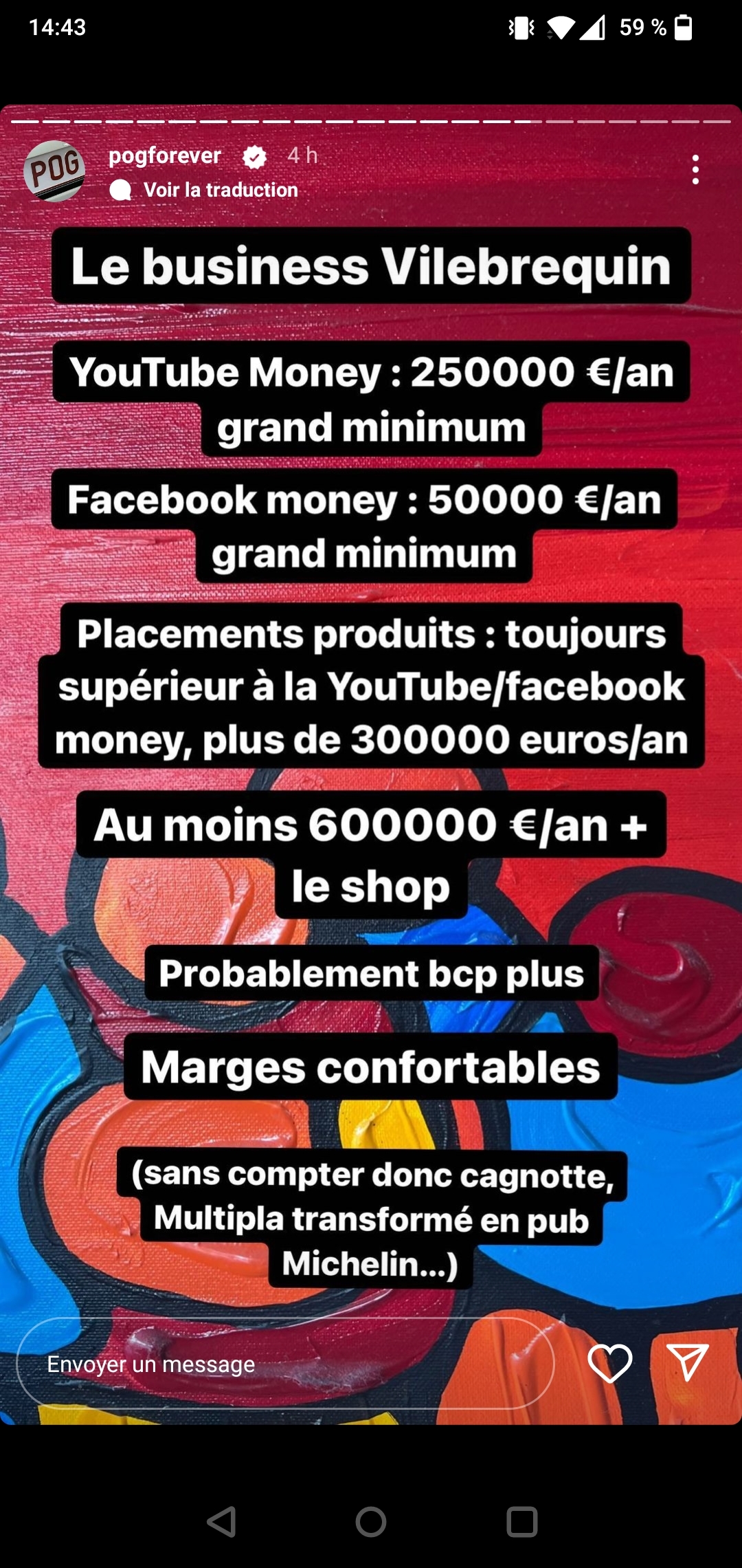 Ouais, beaucoup de critiques ne tiennent pas compte du temps, comme si la cagnotte commençait aujourd'hui dans leur situation actuelle. Après pour le reste, VB brasse de l'argent ? Tant mieux pour eux. Ils ne veulent pas le mettre dans l'amélioration de la chaine ? Tant pis pour nous et ils le ressentiront sur la durée mais c'est leur problème. Sylvain n'a jamais caché qu'il voulait se payer une Ferrari et j'imagine qu'ils ne vont pas faire cette chaine pendant 10 ans pour juste le lol si ça peut leur permettre d'être riches. Ils sont aussi un peu coincés entre devoir faire plus mais tout en voulant garder le côté "simple" de leur chaîne. Pour le moment c'est pas trop réussi, mais en même temps si on te propose d'essayer des supercars pour ta chaine, est-ce que t'as vraiment envie de faire une caisse standard à la place même si t'as bcp plus de libertés ?