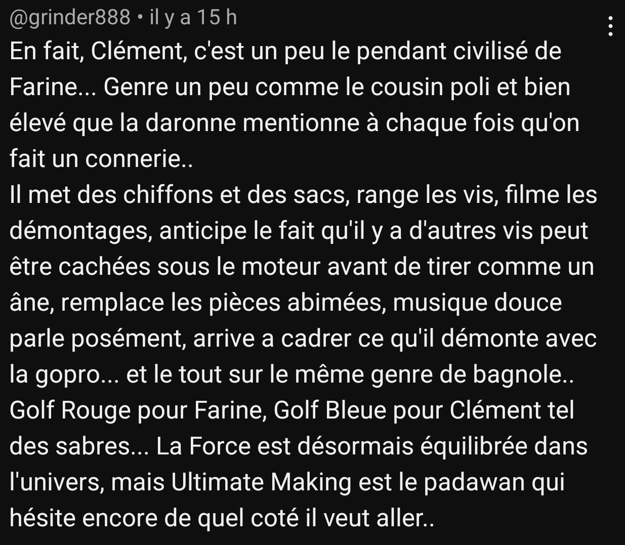 C'est un peu le truc que les gens ne veulent pas comprendre dans l'histoire. Au début de VB, ils ont fait des essais et des petits tours avec des caisses de gens qui leur proposaient, mais le but de la vidéo c'était de présenter la voiture, pas le proprio. Ils ont raconté qu'ils ont souvent eu le cas de proprios qui ne voulaient pas laisser conduire la caisse sans eux ou qui voulaient être dans la vidéo (voire ils ont eu le papa qui s'est rendu compte que le fiston avait prêté sa caisse pour une vidéo et a gueulé). Sylvain il veut pas faire du Akram, il veut faire du "Le Petit Tour" VB en attendant d'avoir plus de matière pour faire mieux, du coup il demande si y'a des gens pour prêter leur caisse pour faire une séquence, mais comme il a connu le problème avec VB des gens qui veulent être dans la vidéo et pas prêter la caisse sans y être, il prévient avant parce que s'il choisit une caisse dans son live et que le mec fait marche arrière, il est bien emmerdé. En fait c'est EXACTEMENT "Le Petit Tour" qu'il veut faire, mais les gens veulent absolument dire que c'est du Akram style parce que c'est forcément de la merde. "Non mais c'est scandaleux quoi, il veut faire du Akram quoi mais il veut pas faire comme Akram, c'est doublement naze !" Message édité par Sly Angel le 22-12-2023 à 21:53:49 --------------- Fan et séquestrateur de |