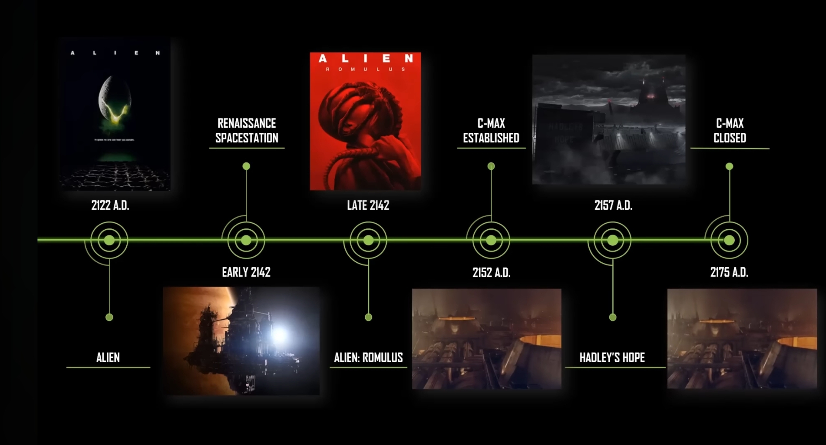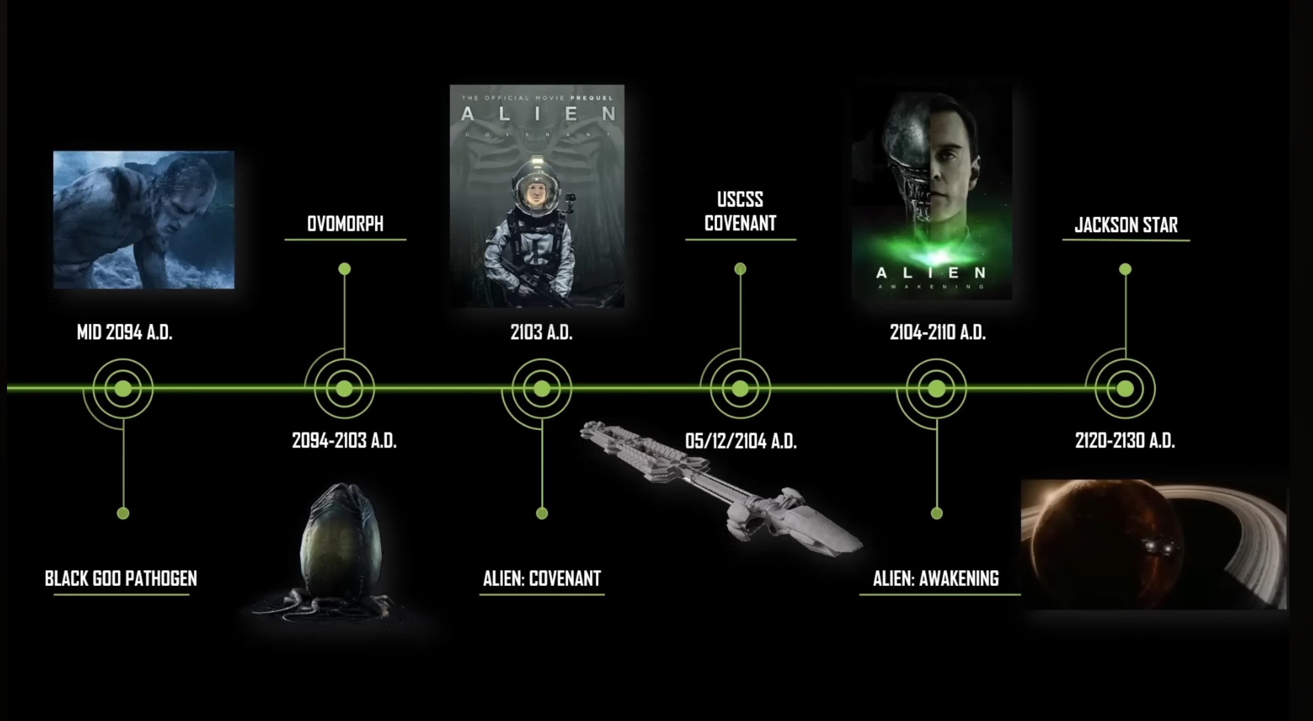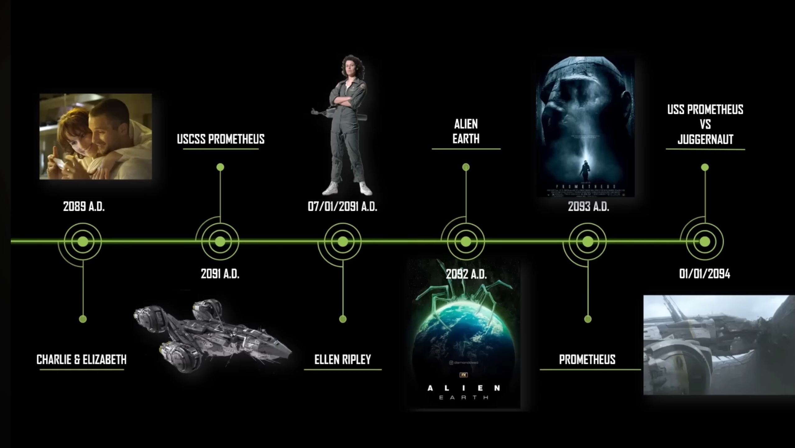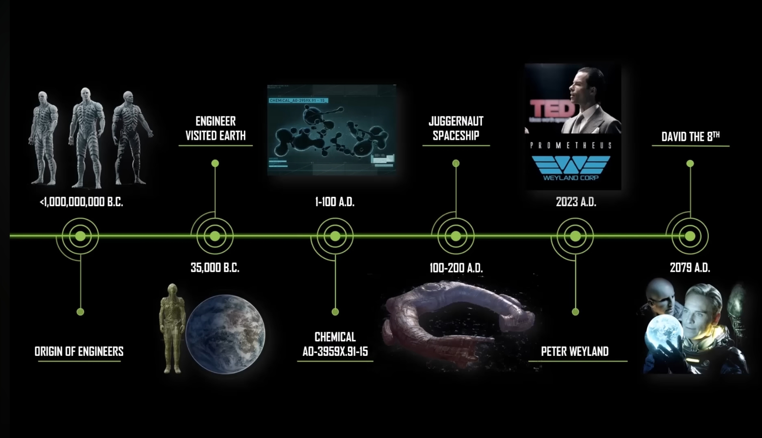 LeGrandMatheux Animateur | La timeline j'en ai cherché une ultime en graphique (lieux, dates, mais non c'est apparemment trop compliqué, il y'a ce site, j'avais oublié qu'il y avait plein de mini vidéos complémentaires à Prometheus (2012) et même un court métrage :