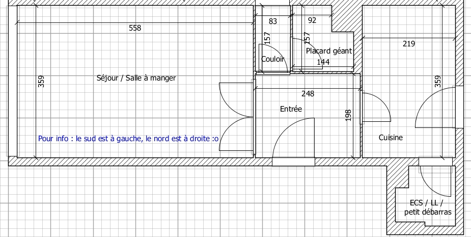 - Le frigo sera derrière la porte (mur du bas). Il ne sera pas collé dans l'angle à cause du radiateur, mais contre le mur du bas.