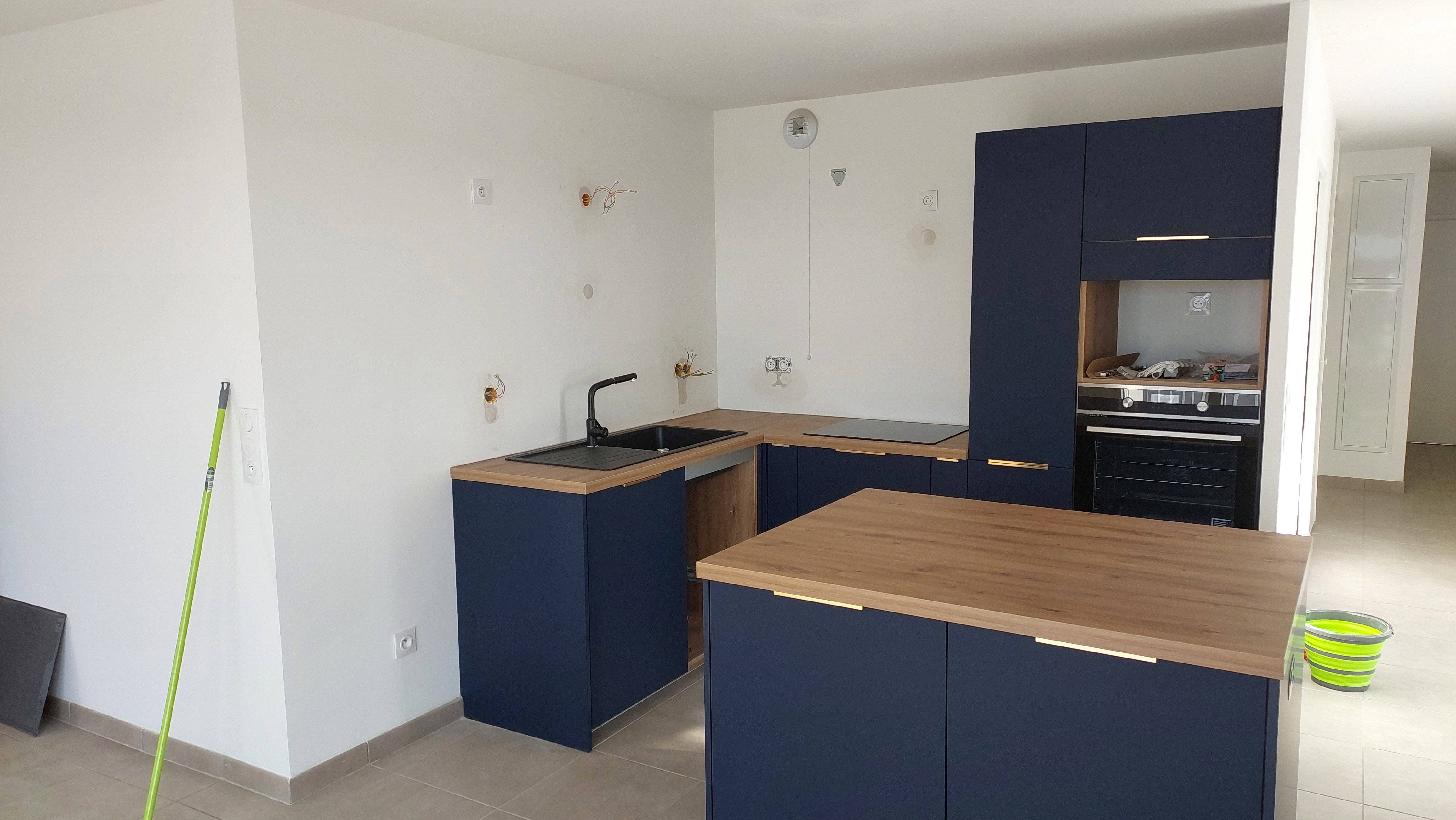 Captotofr | La cuisine avant/après passage des électriciens, la suite (dont les sanitaires qui gênent le tiroir sous évier) reprendra en octobre. (On habite Paris et le nouvel appartement se situe à Toulouse)
