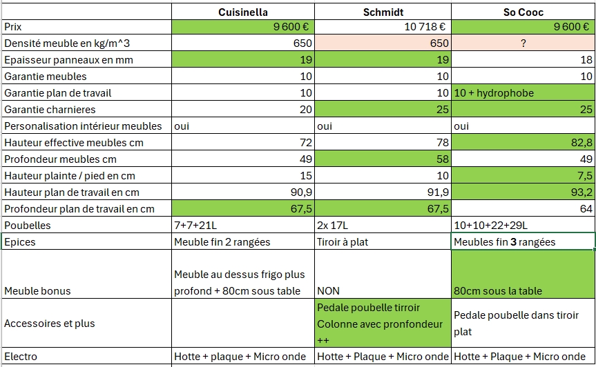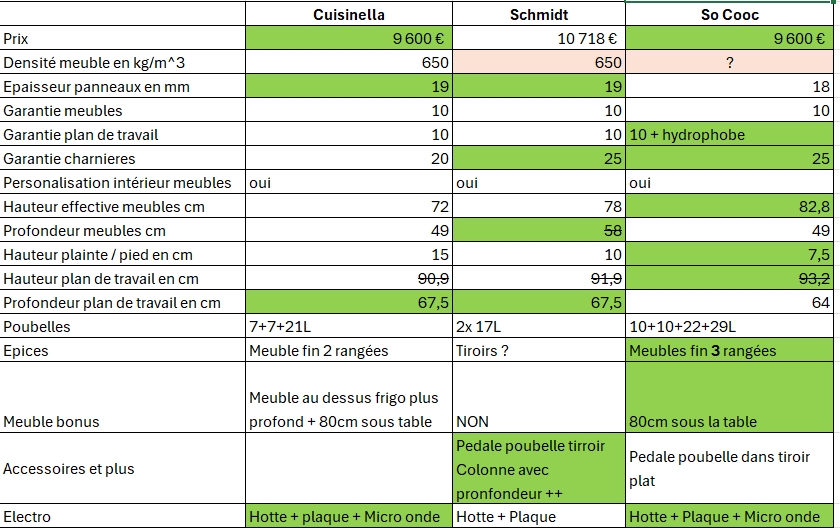 Merci pour la reponse. Concernant la hauteur du plan de travail c'est indiqué dans mon tableau. Le max chez moi est 93cm car il y a une fenêtre et c'est socooc qui va au plus haut a 1cm pres grâce a leur meubles plus grand. Pour les caissons ils n'ont qu'une seule gamme chez schmidt ou socooc apparement. les facdes ou les plans de travail il y a des différences. Schmidt viens de m'appeler et ils ajoutent le micro-ondes dans leur offre sans changer le prix. Donc j'ai presque la meme chose pour 1000€ de plus chez Schmidt par rapport a socooc. Avec l'avantage des meubles profonds pour Schmidt surtout pour la colonne et des meubles haut pour socooc. Dilemme Message cité 1 fois Message édité par LaMoR le 28-03-2025 à 13:26:55 --------------- Garage GT5 |