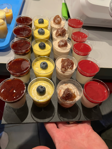 Sebwap ... . -... .-- .- .--. | Je retiens l'idée des multiples verrines pour mettre de la couleur sur la table en fin de repas. C'est du boulot par contre pour varier les choix |