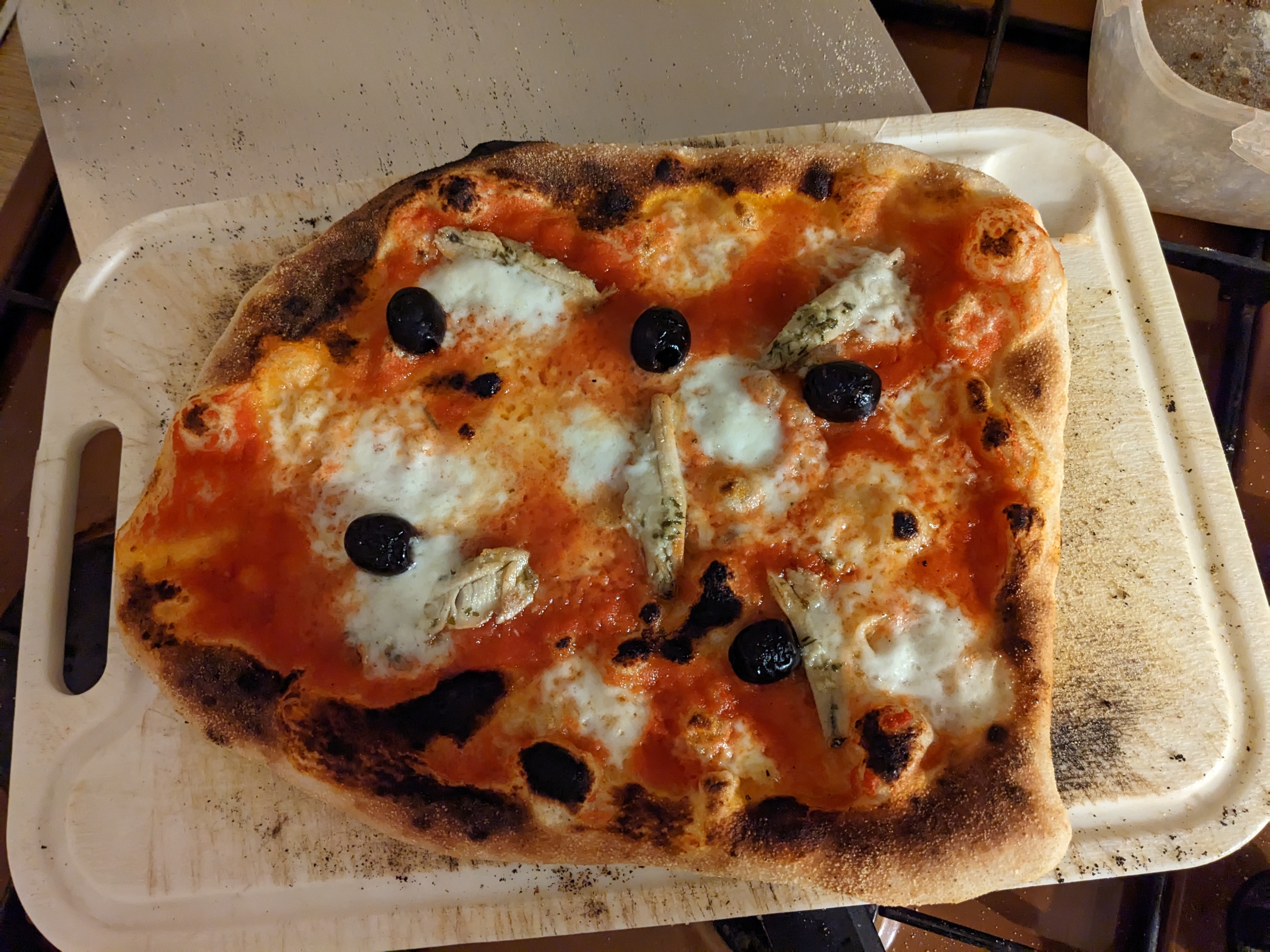 Berkout143 | Toute première session ce soir, pas évidente mais avec beaucoup de plaisir à partager la préparation et la dégustation avec mes hôtes. La meilleure farine que j'ai pu trouver pas trop loin est de la Monfournil W270, donc protocole sur ~12h TA. 10min de pétrissage au robot, 1h30 de pointage puis 12h d'aprêt. RafCalc n'autorise pas moins de 15°C pour la TA, en rentrant ce soir à 18h il faisait 12 dans la cuisine... Je trouvais les pâtons un peu fermes et pas hyper levés, mais une fois en mains je m'en suis accommodé. Température pas super homogène dans le four, avec une température extérieure à 3°C il fallait bien jouer de la rotation pour arriver à une cuisson vaguement équilibrée. Je suis néanmoins ravi du résultat, je vois une belle marge de progression mais je me suis régalé dans tout les sens du terme et les convives ont adoré. Il est vrai que dans ma vallée reculée de bousie le standard local des pizzas est pas bien haut Quelques images pour illustrer : --------------- Des bambées dans les Pyrénées et ailleurs... |