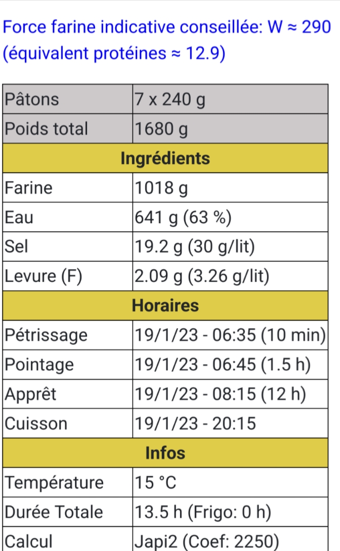 Bon démarrage, à ces températures là et sur cette durée là il te faudrait plus de levure. Pour la même quantité de pâte essaie avec 4gr. Essaie l'appli pizzapp aussi car Rafcalc n'est pas top pour ce type de protocole je trouve (frigo ou basse température). Dans le doute tu prends la moyenne entre les 2 quantités de levure que te donne ces applications. |
