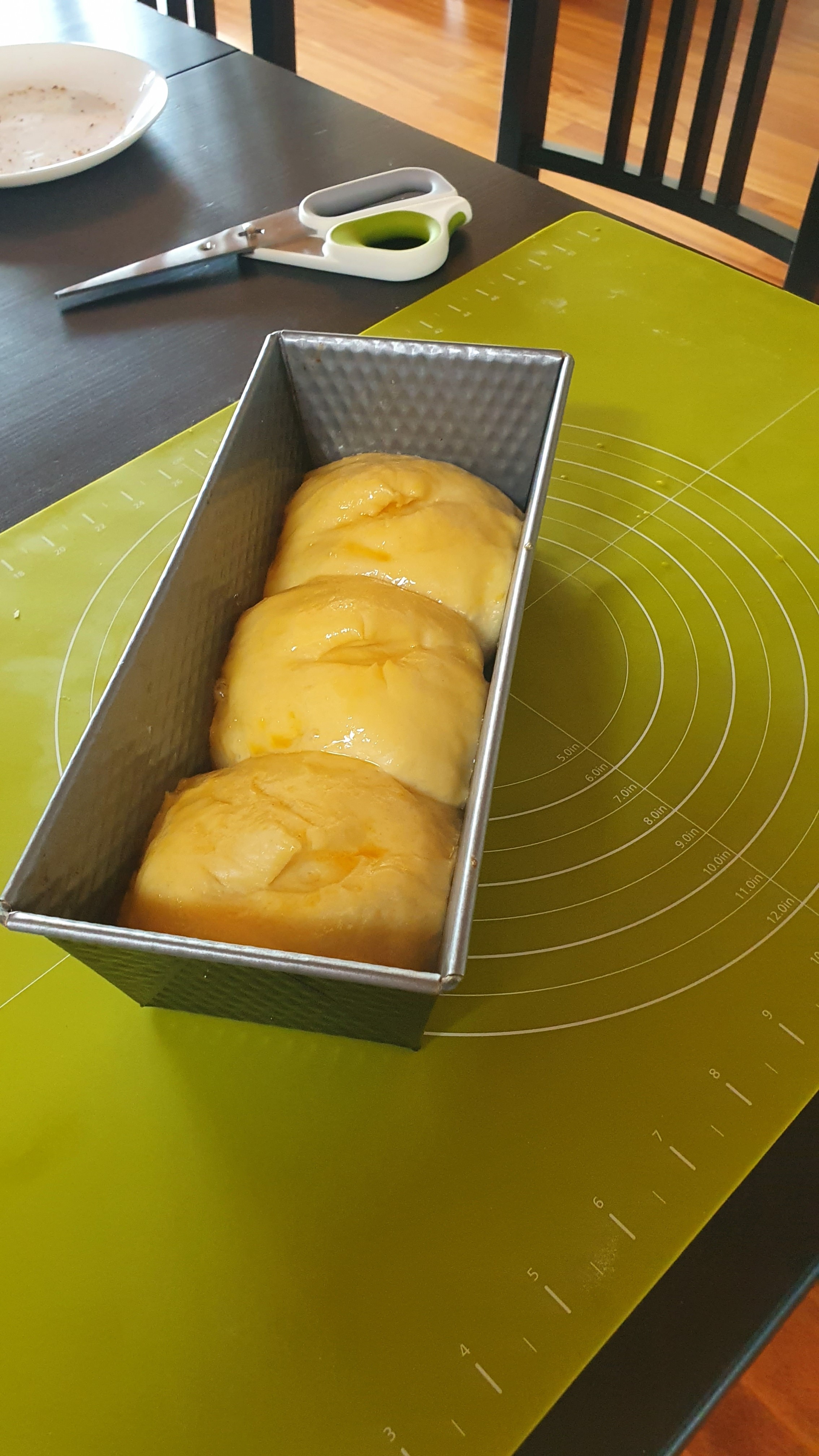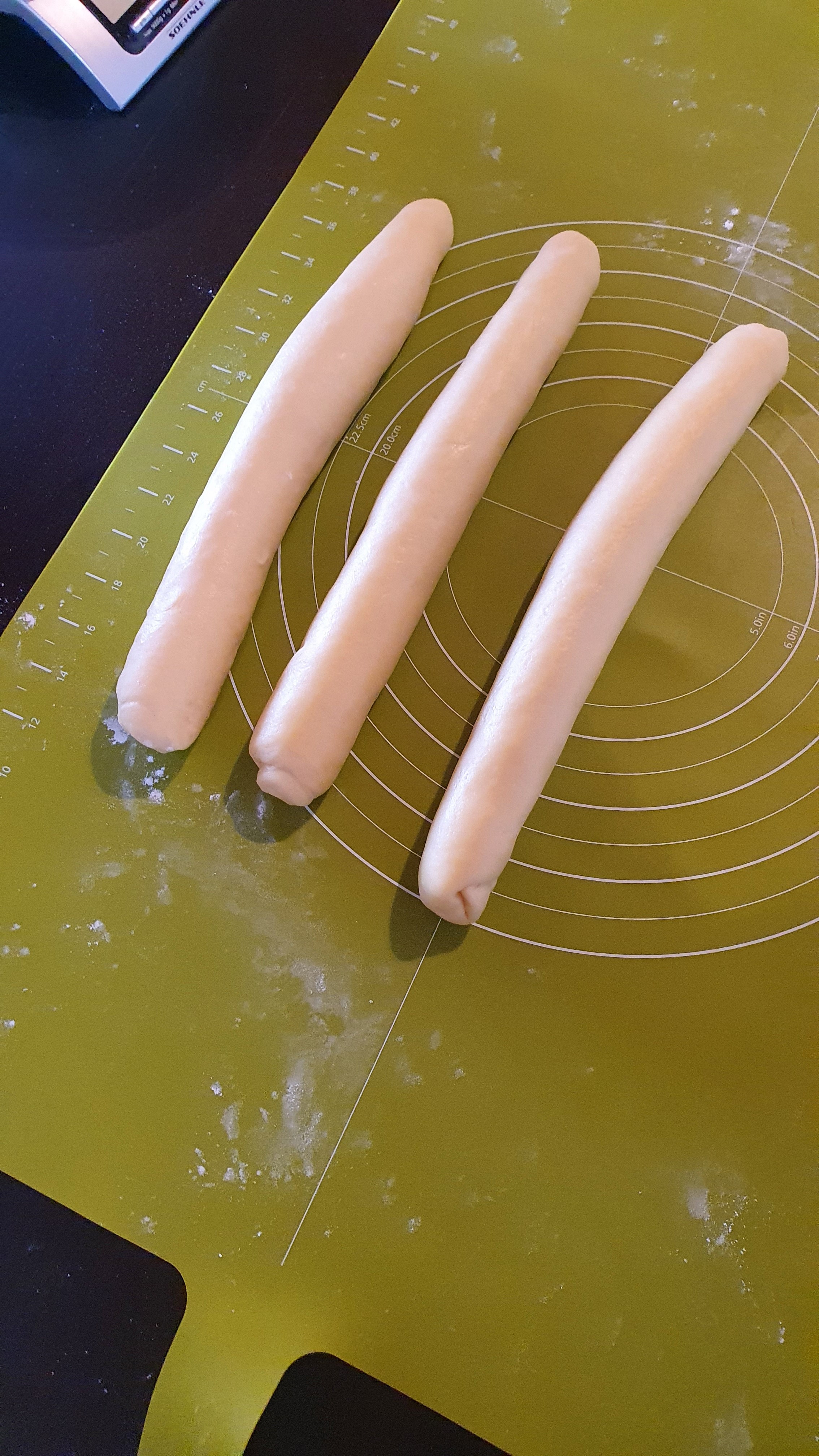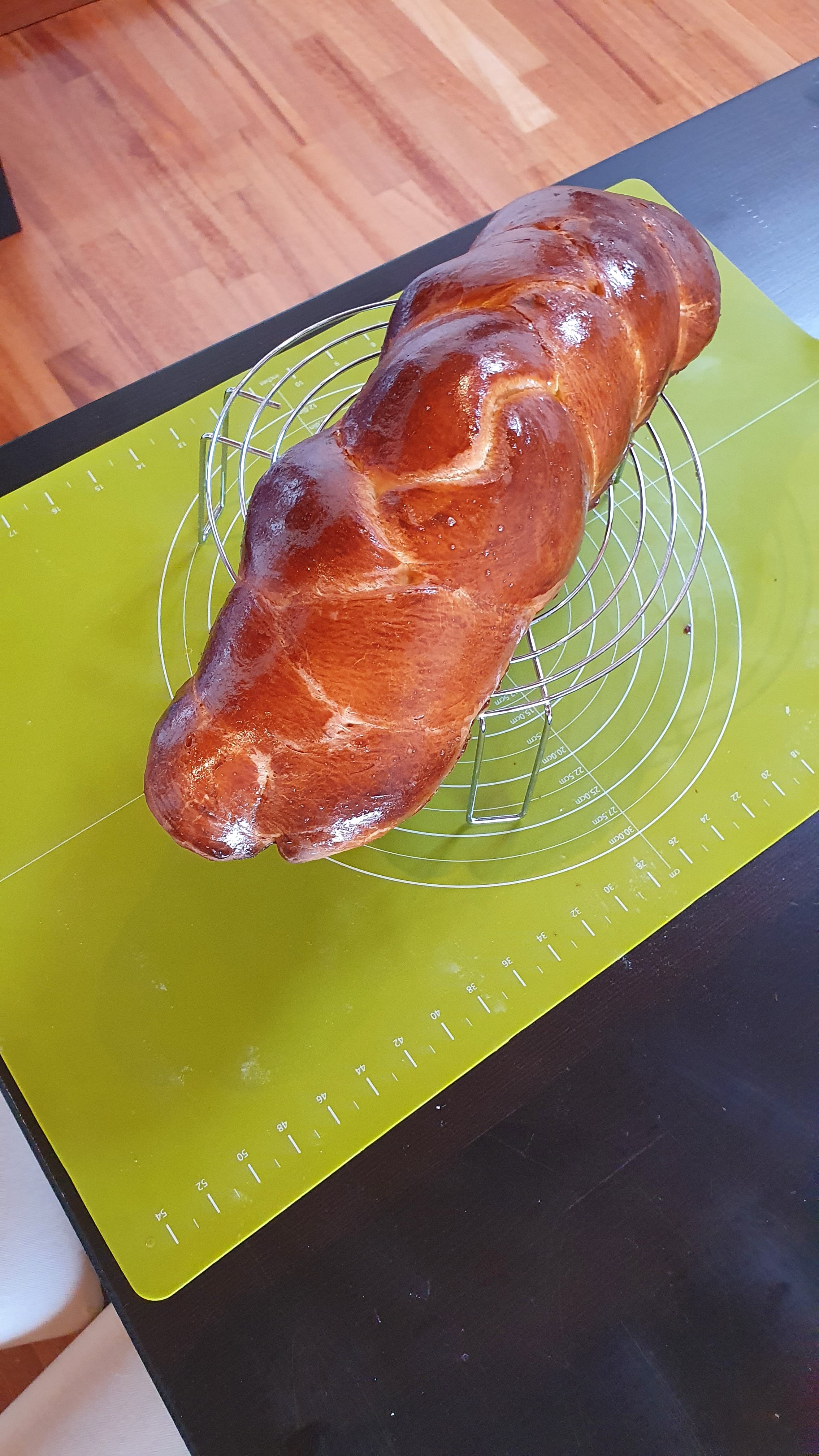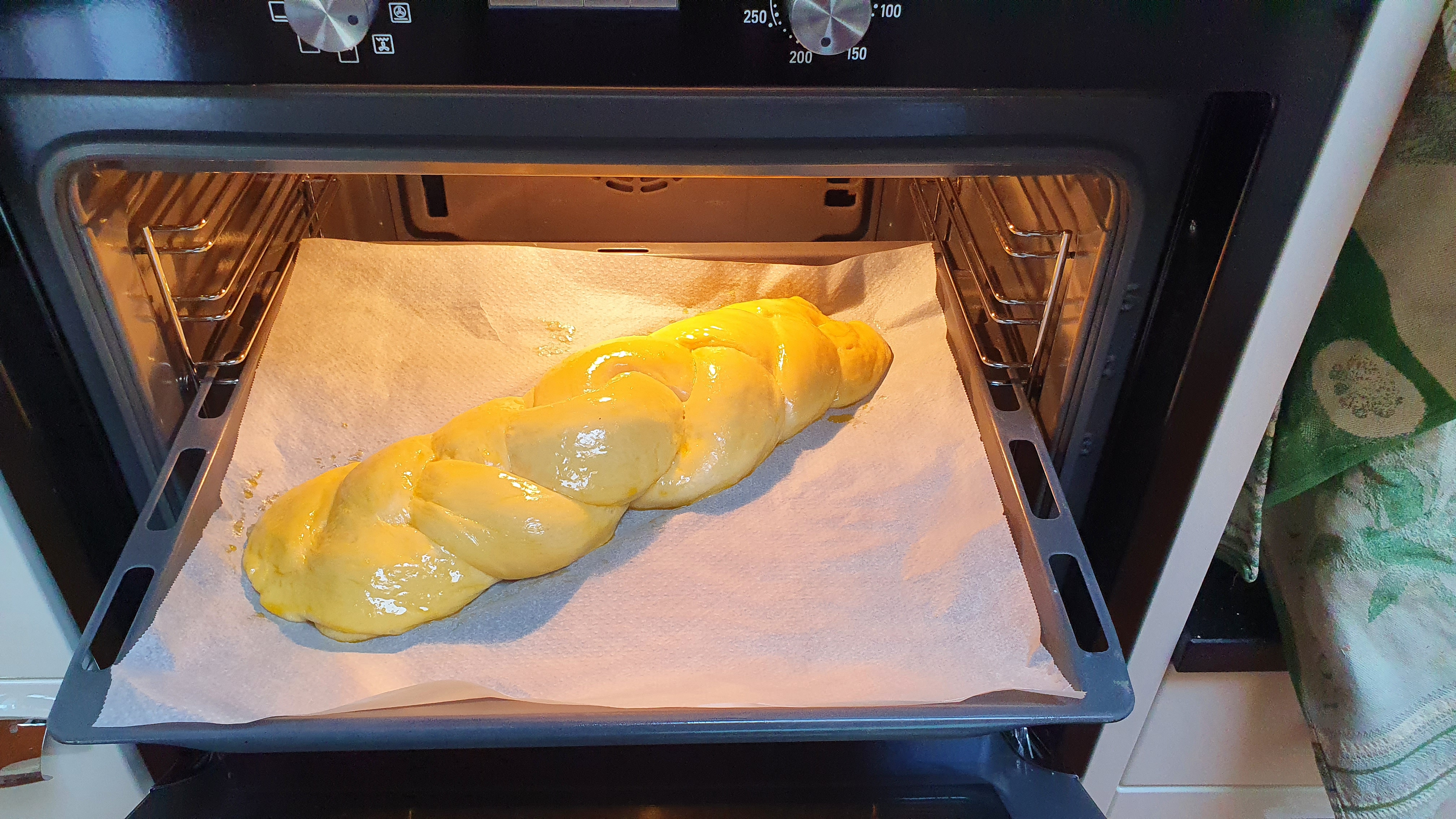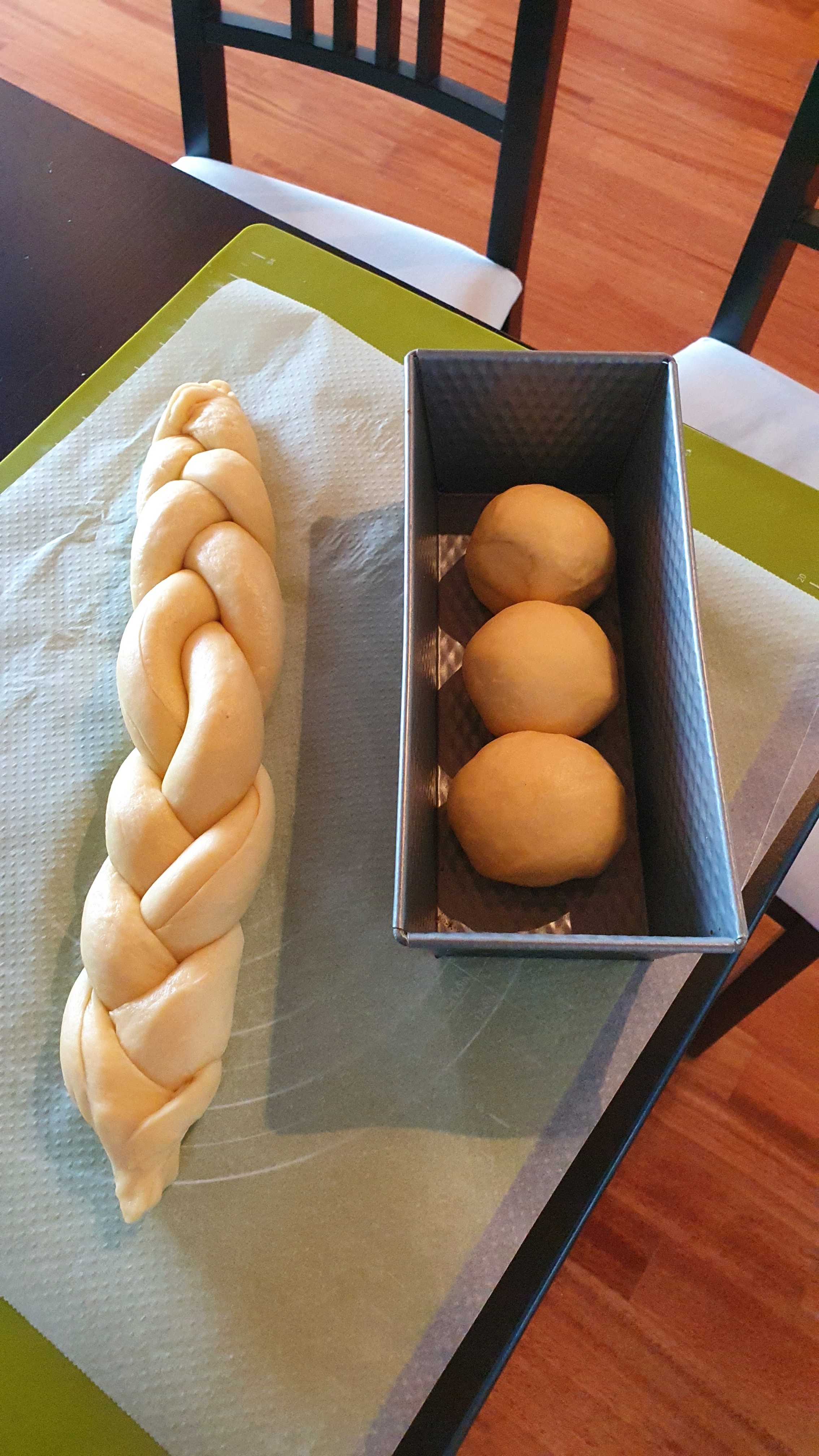Ça a légèrement crouté ... j'aurais du filmer en plus du couvercle ou à la place. J'ai dix minute de pousse et ensuite, ça tresse. Puis apprêt au four temp modérée, dorure et zou ! |
