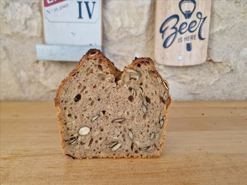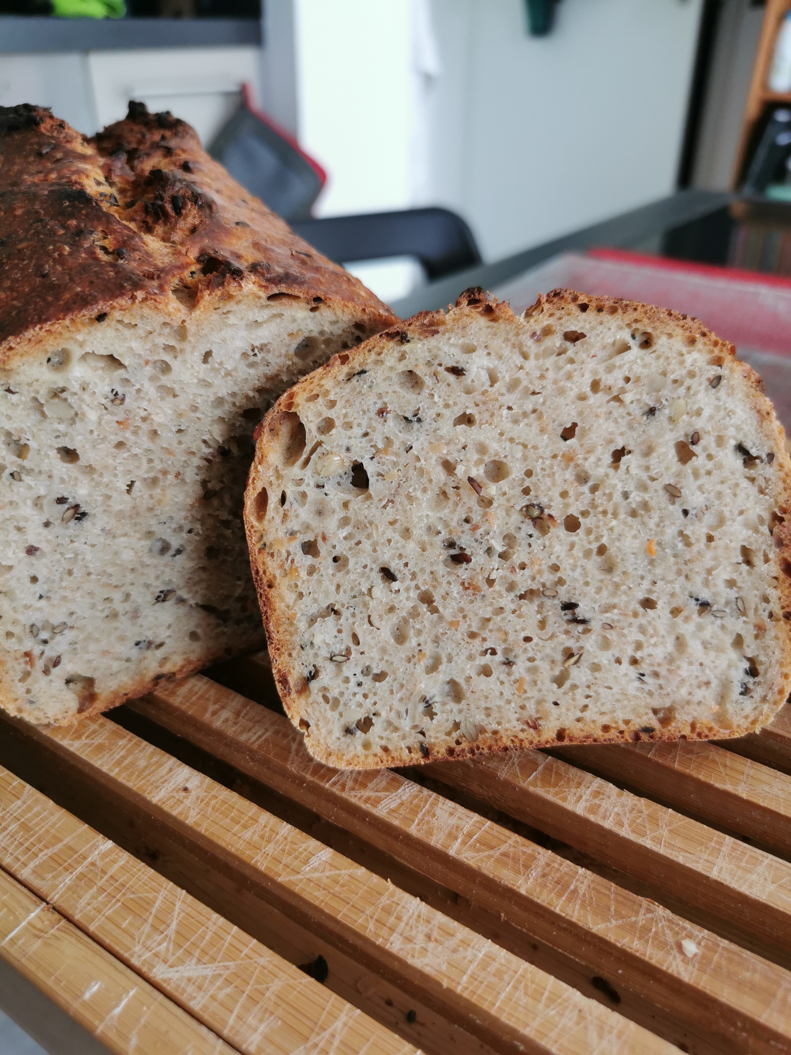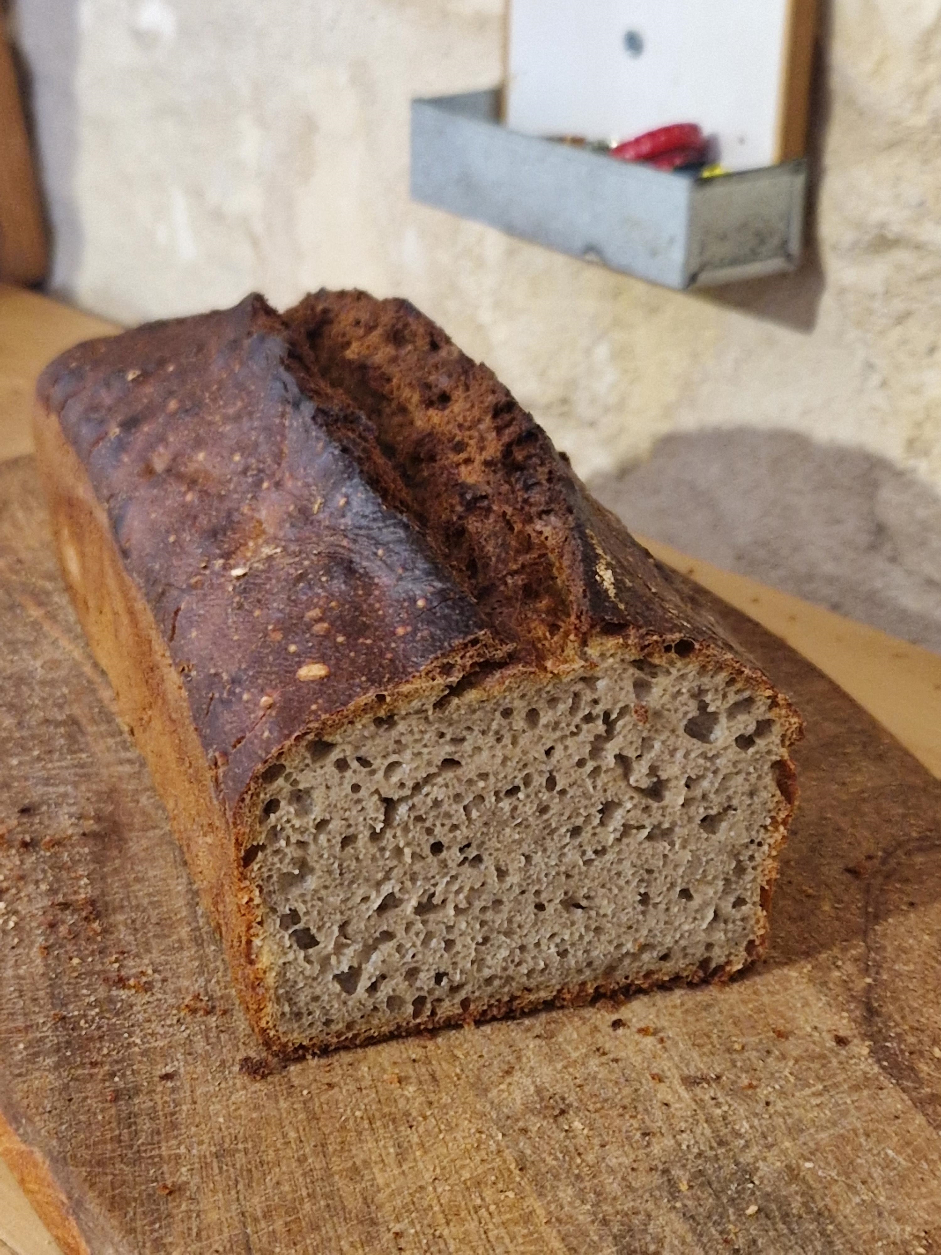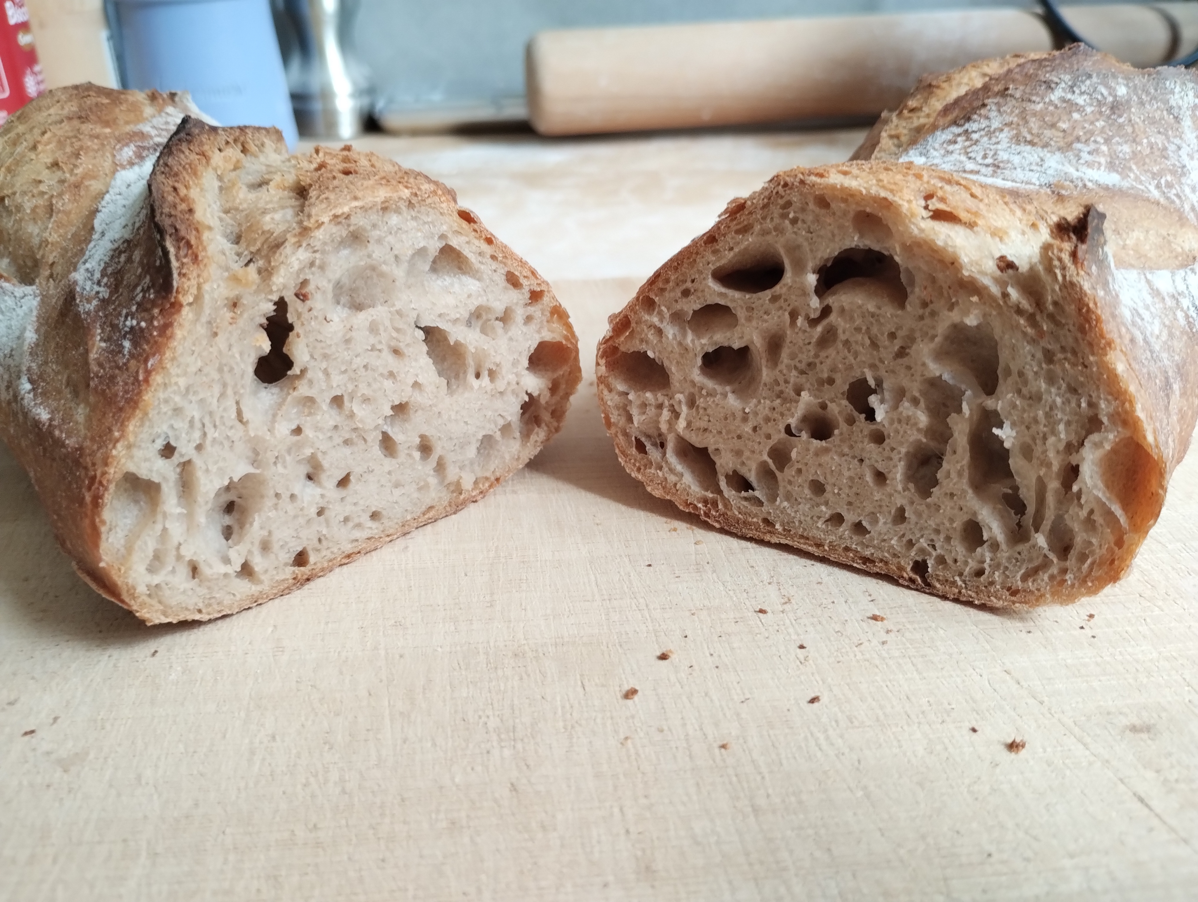 Kaffeine Noisette | Joli ! T'arrives à pétrir à ce taux d'hydratation avec des farines completes ou tu touilles plus que autre chose ? |