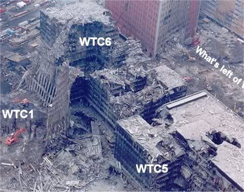 - Non les WTC 1 et 2 se sont effondrées parce qu'elles ont été frappées par des avions et ensuite par un incendie. - Effectivement, le WTC7 se trouve derrière le WTC6 et 5 qui le sépare du WTC1. Mais les WTC6 et 5 ne sont pas des tours, ils ne font que quelques étages, et ne protègent en rien le WTC 7 de la chute des débris lors des effondrements. WTC6 et 5 après la chute des TT: http://i49.photobucket.com/albums/ [...] /zero2.jpg - Carte des dégats : http://img508.imageshack.us/img508 [...] ngsdg2.gif - Le WTC7 s'effondre évidemment rapidement puisque le point de rupture se situe à sa base, tout un coin de la structure est détruite suite l'effondrement des TT, la gravité fait tout simplement le reste, comme lors d'une démolition controlée d'ailleurs. De plus la tour est ravagée par un incendie durant quelques heures comme en témoignent plusieurs pompiers. http://fr.youtube.com/watch?v=5WVBAYEEeAg - les pompiers sont évacués de la tour et décident de la laisser s'effondre naturellement à peu près 2h avant sa chute, quelques témoignages pour se rendre compte de l'intensité de l'incendie: Citation :