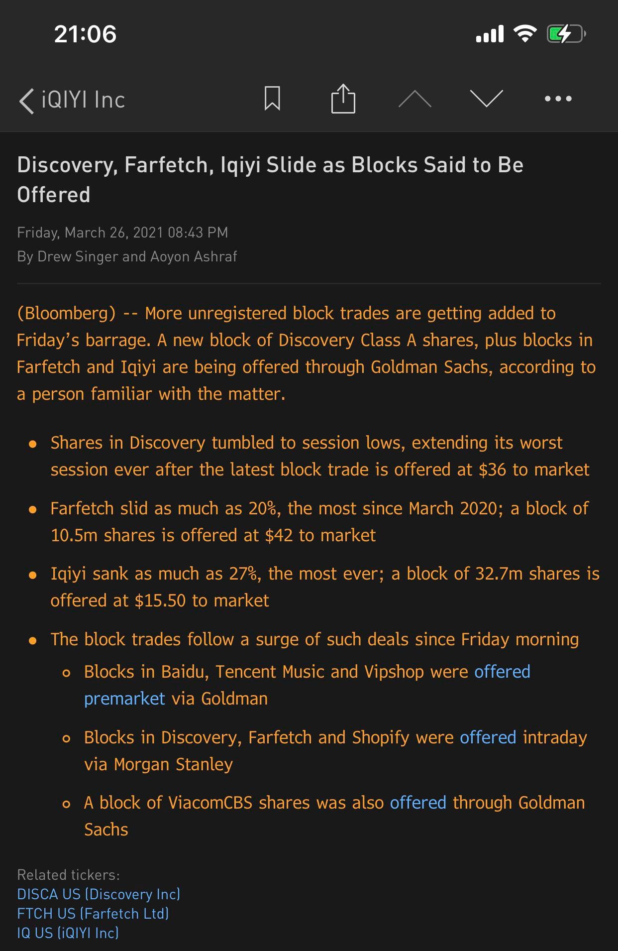 Tickers impactés: BIDU, TME, VIPS, DISCA, DISCK, FTCH, SHOP, VIAC, FUBO Ca ressemble donc à un bon gros margin call. Plus qu'à espérer que ce soit (ou pas) le premier (seul) domino. Faudrait pas que Cathie se prenne un appel de marge
