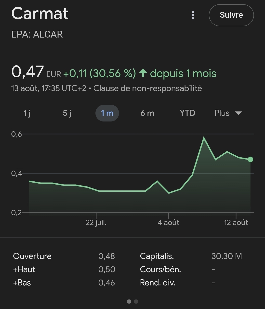 Rhadamenthos 6EQUJ5 | Ouch, y aura beaucoup de gens coincés chez Carmat. "Suspension de cours avec risque de perte significatif pouvant porter sur l’integralité du capital, et de liquidation y compris a brève échéance", dit le communiqué. En même temps c’était le jeu. --------------- "Toutes choses sont dites déjà ; mais comme personne n'écoute, il faut toujours recommencer" - André Gide, Le Traité du Narcisse |