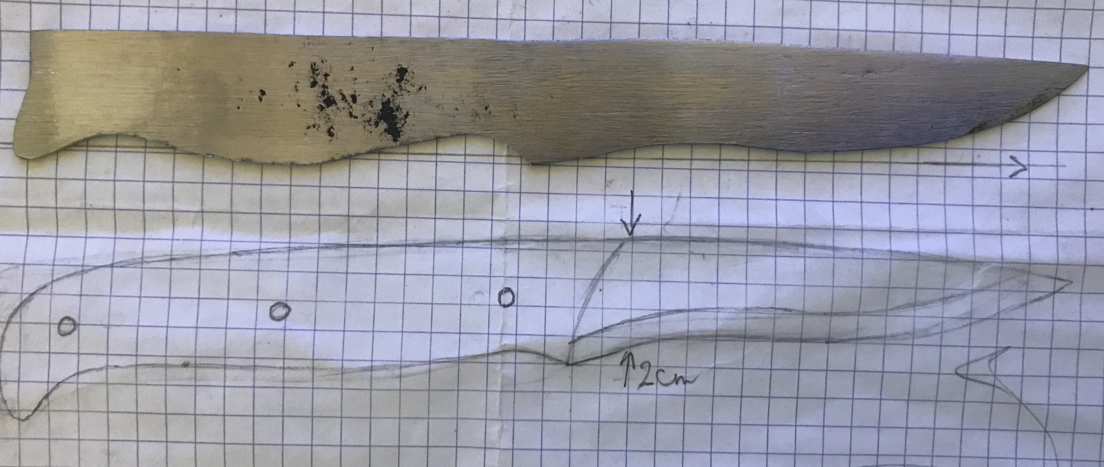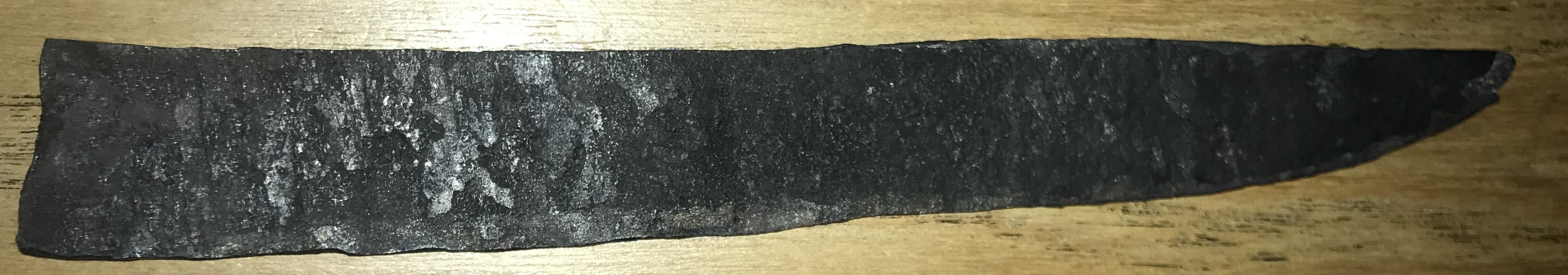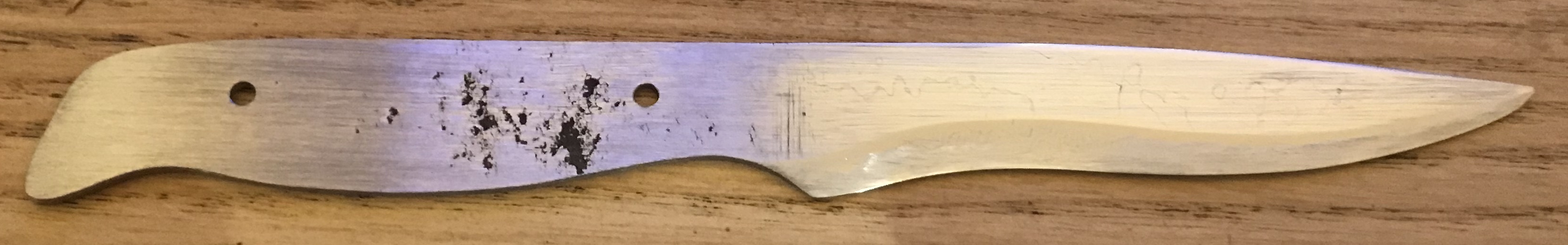 Le sandwich a l'air bien soudé, j'avais hésité à le couper en deux pour voir si le coeur est bien soudé également, mais tant qu'à faire je vais probablement former une lame et je verrais bien le résultat. Qu'entends tu par "traiter" ? Bref, je vais probablement choisir l'option d'une lame courte en soie partielle, ça me donnera l'occasion d'essayer un autre type de manche, j'aimerais bien faire une soie partielle cachée avec deux rivets. Sinon, pour la prochaine lame ça te semble aussi trop peu ? La lame en question : Message édité par artouillassse le 13-01-2026 à 08:37:08 --------------- Rien pour le moment |