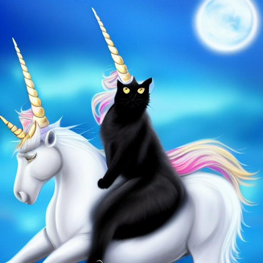 "a black cat with blue eyes riding a white unicorn, digital art, high quality, highly detailed"