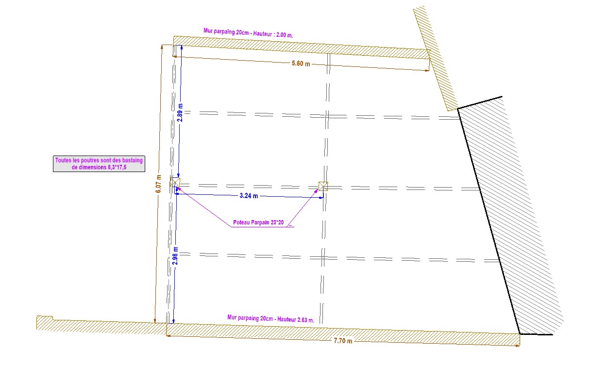 Sauf erreur (corrigez moi), ta poutre frontale reprend la zone de couverture en jaune : Ce qui représente à la louche : - env 7.5m² [(6.07-(2.98/4)-(2.89/4))*(3.24/2)] de bac acier, à disons 10kg/m², ça représente 75kg Soit env 1,5kN de charges permanentes. Ajoutons : En mettant ça dans un calculateur lambda parce que j'ai la flemme et que mes cours de rdm sont loin, je trouve : 60cm de flèche avec une poutre 63x175 La flèche admissible à l'ELS, c'est 2.4cm. Avec du 120x240, j'ai encore 12cm de flèche.