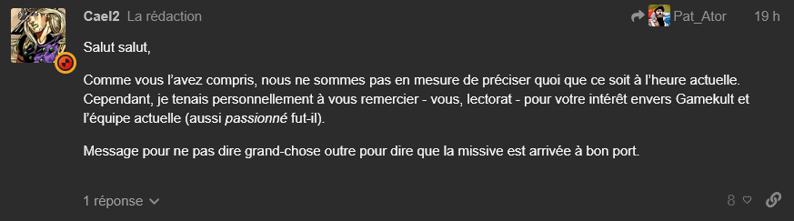 poiuytr \o/ | Ca discute un peu de l'état de GK sur leur forum malgré l'interdiction de communiquer adressée à la rédaction : https://www.gamekult.com/forum/t/re [...] /454132/31