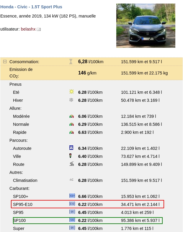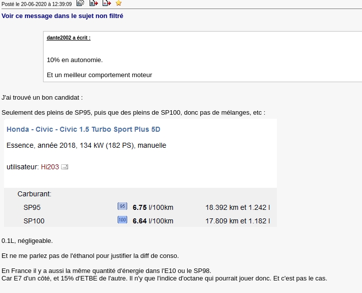 Honda Civic avec le petit 1.5 Turbo assez poussé (182ch). https://www.spritmonitor.de/fr/deta [...] &cdetail=1 https://rehost.diberie.com/Picture/Get/f/425852 Les moteurs conçus pour fonctionner au SP95 ont rarement un meilleur rendement au SP98 ou +, car ils exploitent rarement l'indice d'octane supérieur. Si tu avais une Civic Type R ou une BMW M3 E46 CSL, oui, mais là, non. Et j'avais trouvé de biens meilleurs exemples sur ce site à une époque. Genre 100 000km au SP95-E10 et 150 000km au SP98 sans alterner. Et c'était pareil. Edit : on t'avait déjà remis dans le droit chemin en 2020 sur le topic Choisir sa voiture. https://rehost.diberie.com/Picture/Get/f/425853 Message édité par ClioWilliams le 19-08-2025 à 01:02:43 |