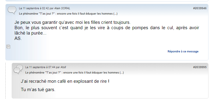 Suffit d'aller sur le site : https://www.egaliteetreconciliation [...] 52139.html --------------- Every time I crashed the internet, it's like, this little drop of truth. Every time I say something that’s extremely truthful out loud, it literally breaks the internet. So what are we getting all of the rest of the time? |