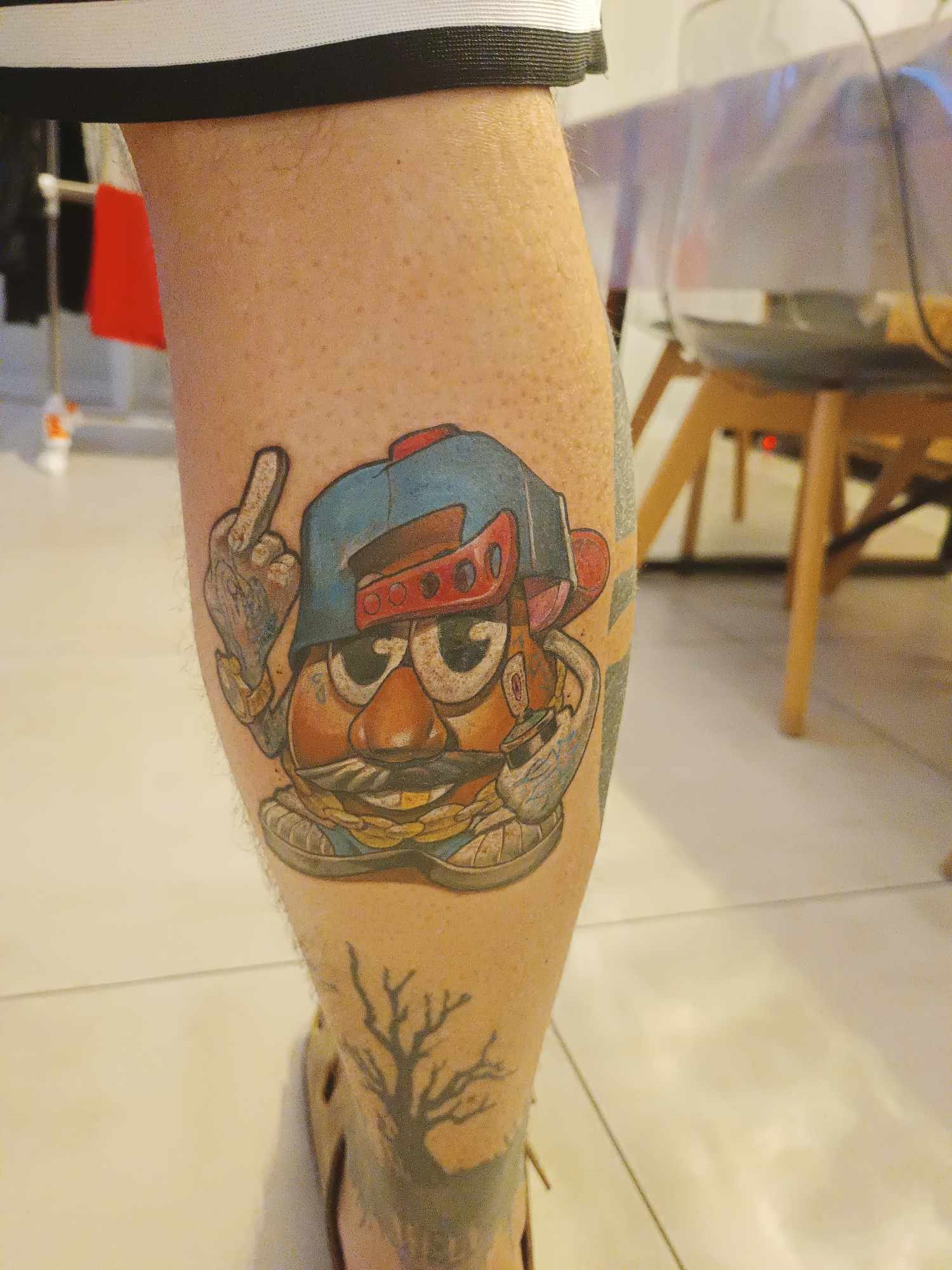 Bon madame qui a commencé le chest samedi, son tatoueur qui lui dit "ha ba demain ya journée flash chez harakiri tattoo, il y a kubiack, osmozer et leguyt", évidemment c'est a 5 mn de chez nous, je décolle de chez moi, j'arrive un poil avant l'ouverture, je suis juste la pour faire un tour "pour voir" :o , résultat on à moins 800 balles sur le compte et j'ai un mr patate de forain sur le mollet (fait par osmozer, et je suis toujours autant admiratif du travail de leguyt).