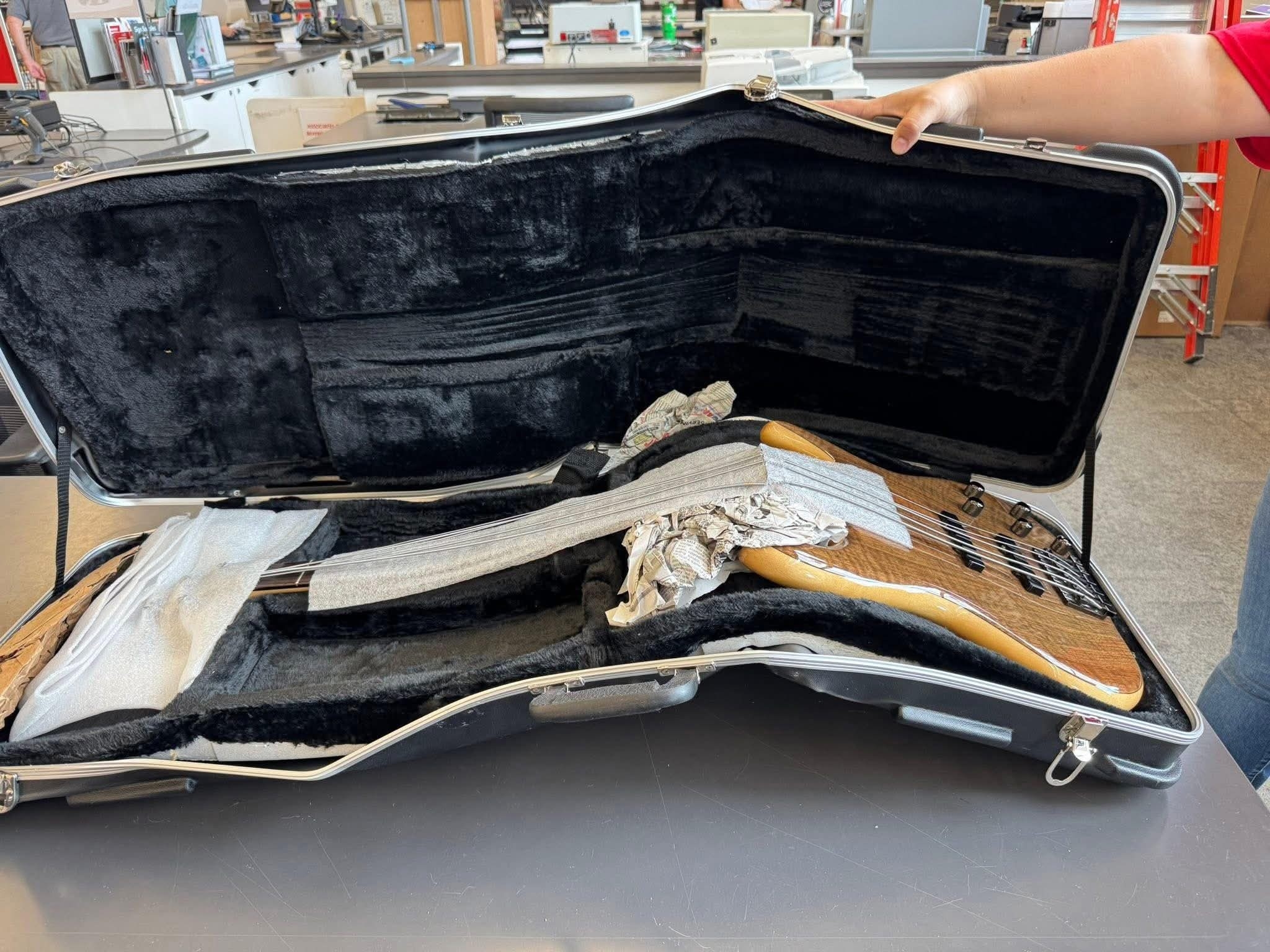 C'est normal, il débute, le case Calton custom ce sera pour son Noël. En attendant, ça protégera suffisamment le repose-genou de la guitare.
