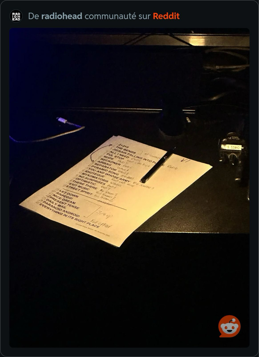 Fender ♪♫♪♫♪♫♪ | J’avais jamais remarqué que Jonny jouait le synthé des refrains de street Spirit … avec la tête de sa guitare pendant qu’il fait les arpèges d’harmonie Message cité 1 fois Message édité par Fender le 22-11-2025 à 21:02:46 --------------- we are the dollars and cents |