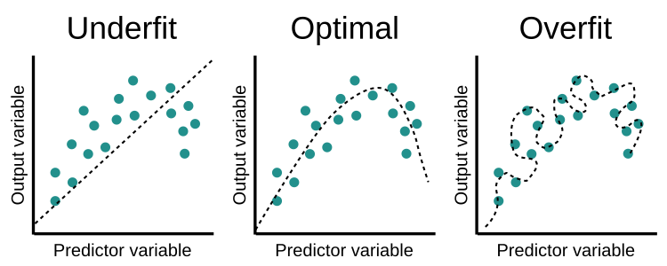 Imagine que tu fais tomber des objets dans le « vide » en fonction de plusieurs critères et tu obtiens ce nuage de point. Dis toi que un « paramètre », c’est une sorte de bouton que tu peux tourner pour coller à la réalité observé. En pratique sur le schéma ci-dessus, la courbe de gauche a très peu de paramètre « libre » (fonction affine, elle a deux paramètres). Elle fait des erreurs.