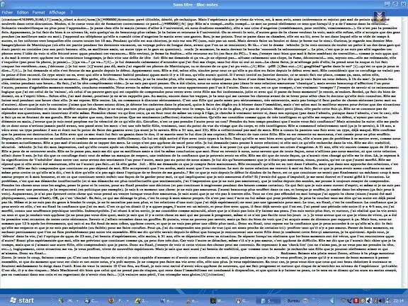 Attention: pavé illisible, désolé, pb technique. Mais l'expérience que je viens de vivre, est, à mon avis, assez intéressante et rejoint pas mal de points qui ont été soulevés dans cette discussion. Modos, si le coeur vous dit de formatter correctement ce pavé... Elle m'a trompé...enfin trompé... ce mot ne prend réellement ce sens que lorsqu'il y a de l'amour dans la relation... Scénario vaudevillesque en plus pour l'apprendre... Je passe chez elle le matin (avant d'aller à l'université, où nous étudions ensemble), elle a une crise d'angoisse (tremblements, peur terrible, vomissements...). Ce n'est pas la première fois. Apparement, je lui fais du bien à ce niveau là, suis quelqu'un de beaucoup plus calme. Je la laisse et retourne à l'université. On se revoit le soir, d'autres gens de la classe veulent la voir, mais elle refuse, elle n'accepte que des gens proches (sa meilleure amie ou moi). J'apprend au téléphone qu'elle a cumulé crise d'angoisse le matin avec une gastro. Bon, je me pointe. Tout se passe dans sa chambre, elle est au lit, avec le seau dans lequel elle se vide de temps à autres, et les toilettes vers lesquelles elle court toutes les 10 mn. Pendant qu'elle est aux chiottes, je suis sur son PC (non, suis pas un nerd. Mais devais faire un boulot et donc je bosse sur le sien). Curieux, je regarde son dossier Mes Images/photos de Martinique (où elle est partie pendant les dernieres vacances, un voyage prévu de longue date, avant que l'on ne se rencontre). Et là... c'est le drame Je la vois entrain de rouler un palot à un des deux gars qui était partit en croisière (sur son petit bateau: elle, sa meilleure amie, un autre type et le gars en question). Je murmure, la main devant la bouche 'ooooooh la salooooooope'... Le pire, c'est que je ne suis pas allé regarder ces photos avec l'idée de voir si elle fricoté avec qqun pendant ces vacances... Elle revient, je ferme la fenêtre... elle retourne au lit (en face du PC)... 5 mn, j'essaye tant bien que mal à faire semblant de travailler... comme je suis qqun qui a du mal à rester avec qqchose sur la conscience longtemps, je fais vite une drôle de tête Elle me demande si ça va...je ne répond pas... allume calmement une clope, la fume, décontracté... zen, soyons zen...elle me redemande, elle s'inquiète (pas pour la photo, je pense)... "ça va...? ça va...?"